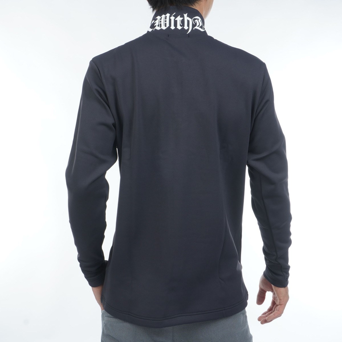 ハイネック部分のロゴが目を惹くハーフジップモックネック長袖シャツ。