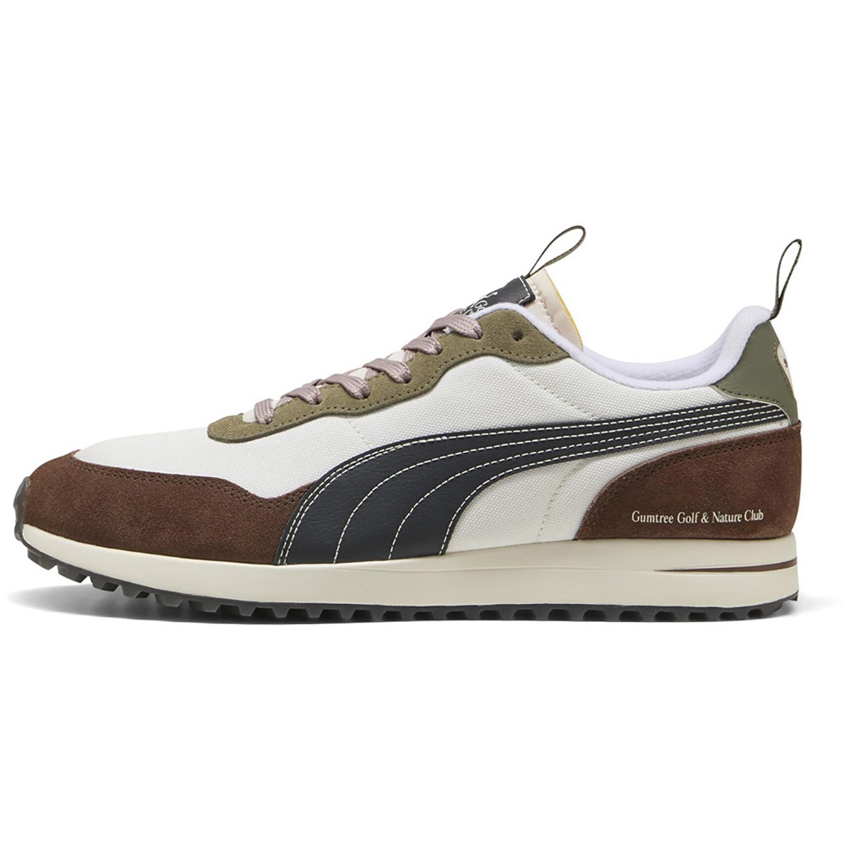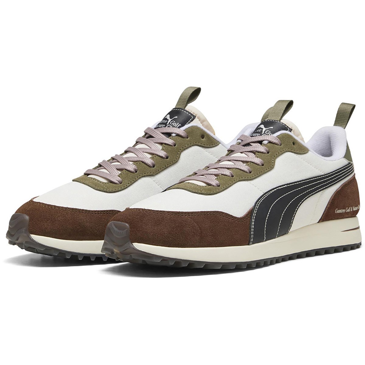 クラシックなPUMAライフスタイルシルエットをゴルフコースに持ち込んだこのデザインは、キャンプ風のアッパー、アウトソールのユニークなプリント、考え抜かれた素材使い、そして機能的なヒールとタンのプルタブが快適さとスタイルを向上。