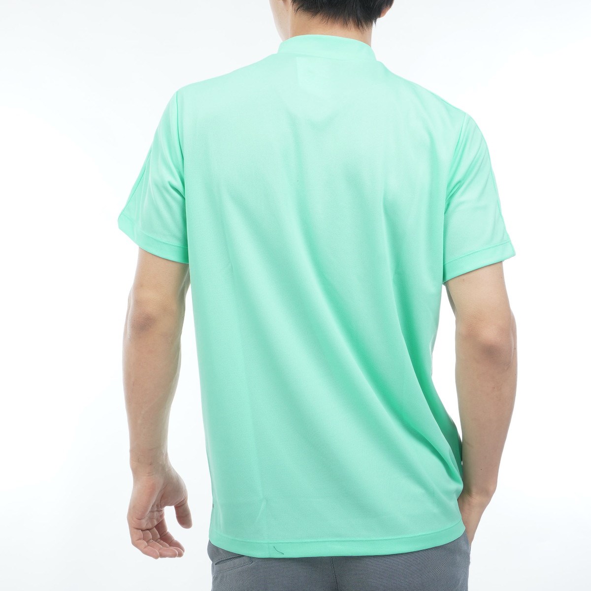 吸水速乾と通気性に優れた鹿の子を使用したベーシックなシルエットの半袖モックネックシャツ。