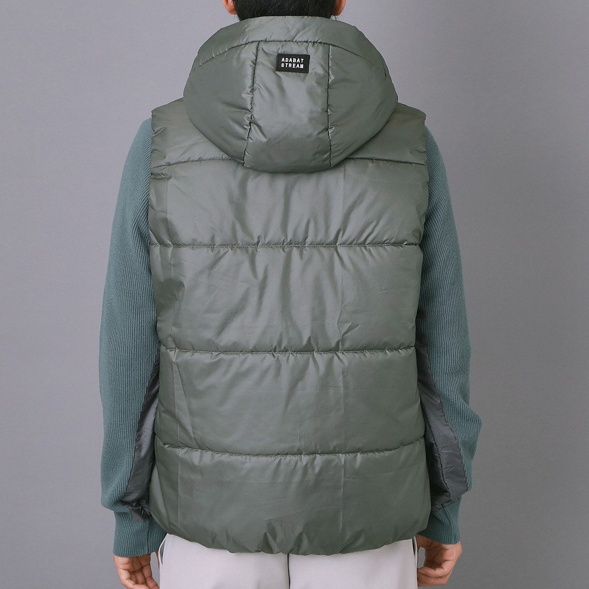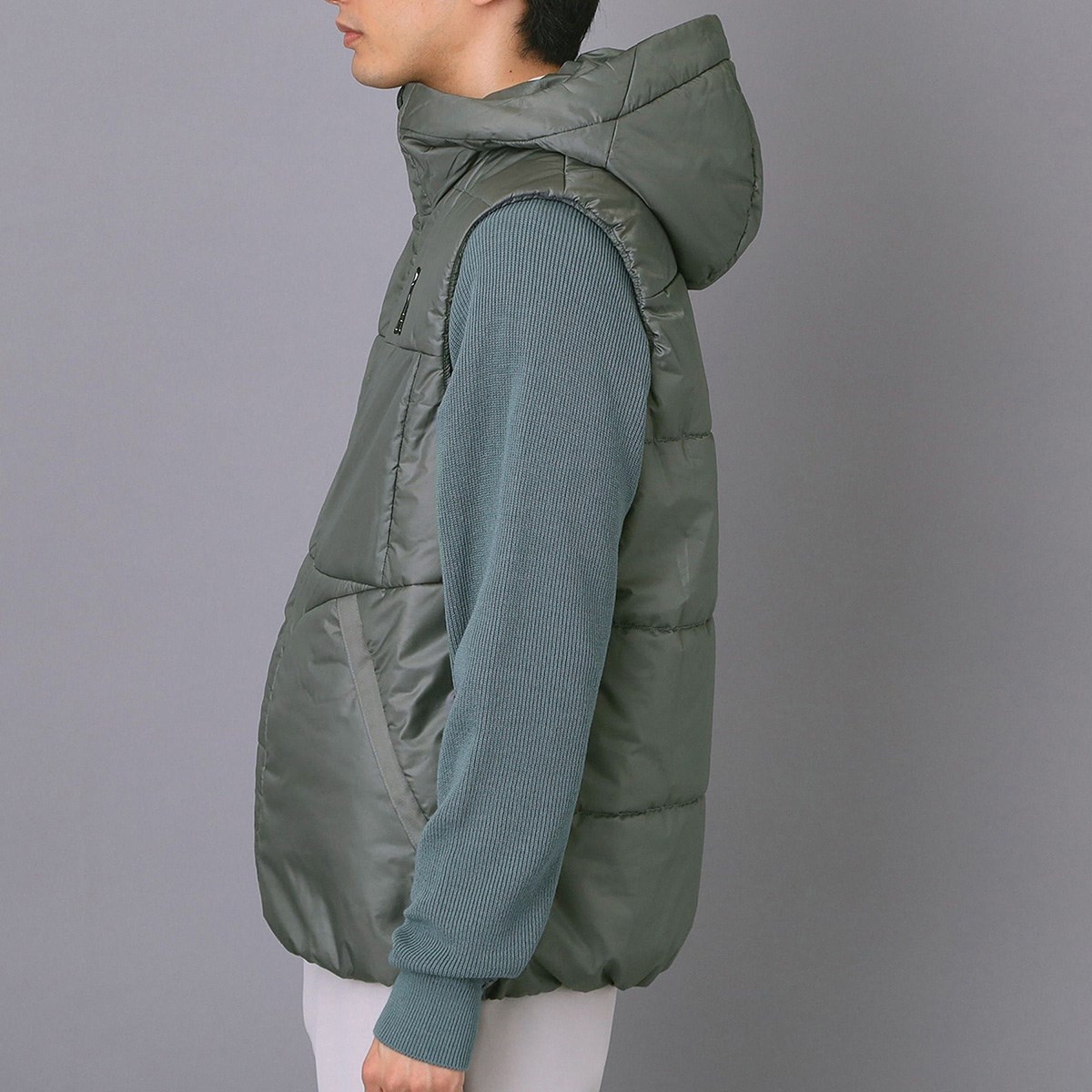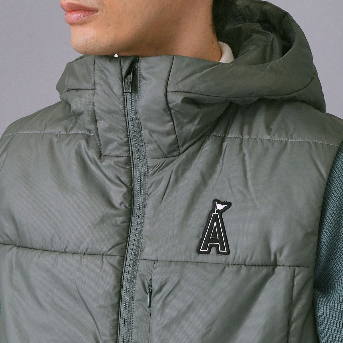 キルティングステッチを極力省いたモダンな薄中綿フーディーベストは、ゴルフコースでのスタイリングにもぴったり。