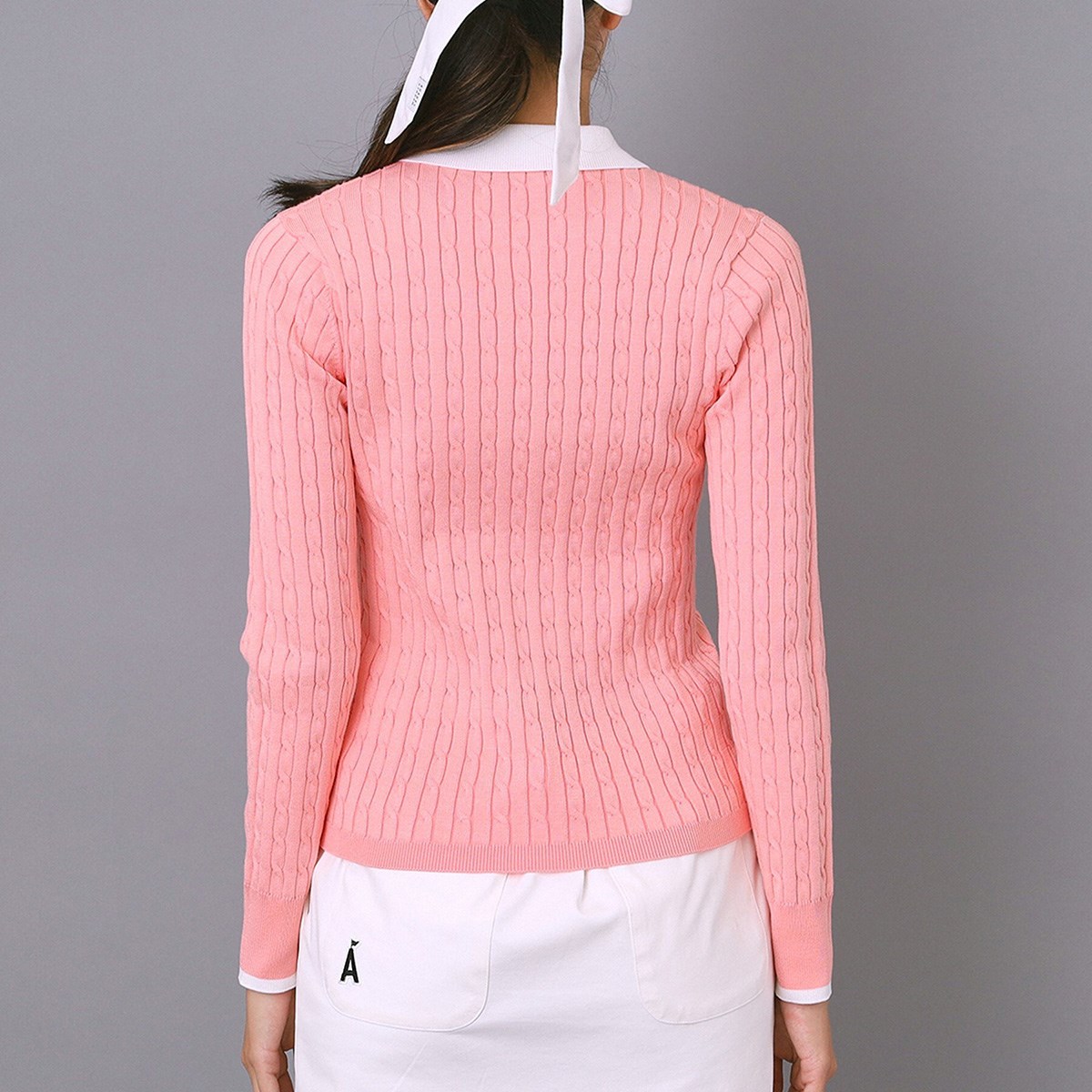 全身を伸縮性のあるケーブルニットで仕上げており、ややタイトフィットのシルエットが体のラインをきれいに見せます。