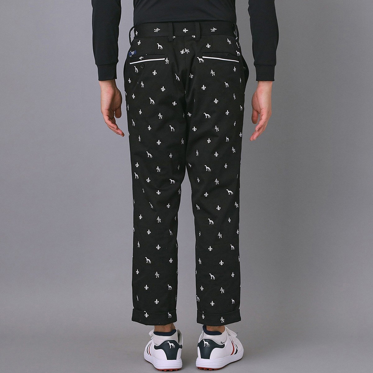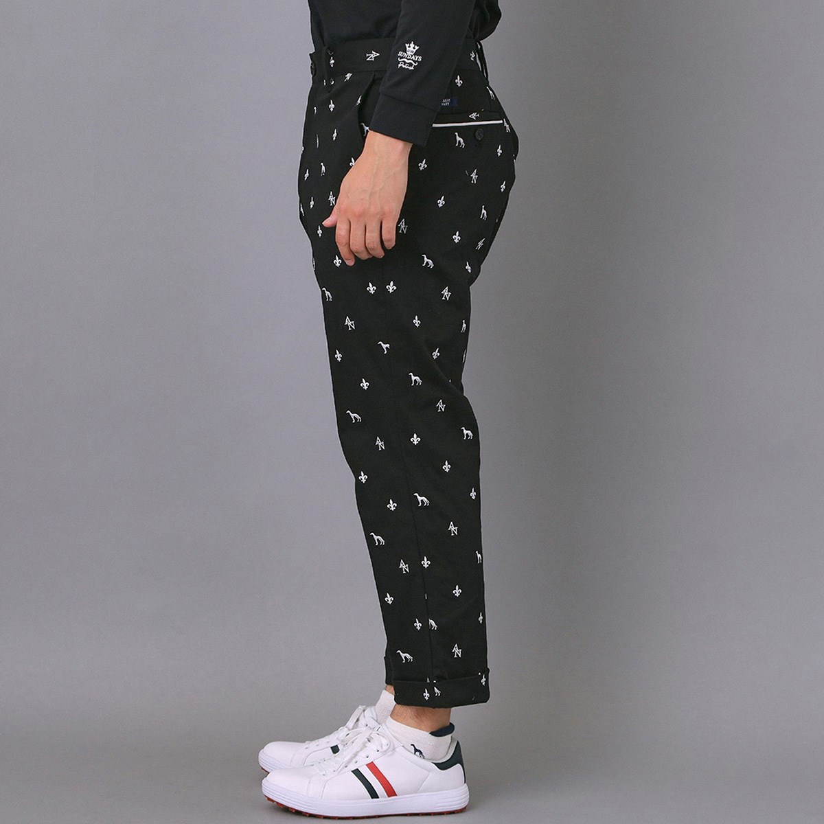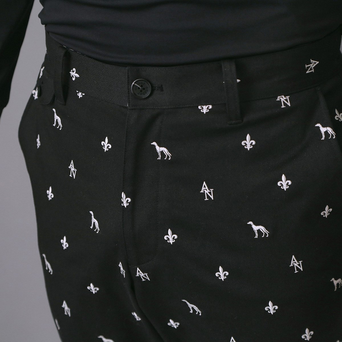 全面にサルーキのモノグラム柄刺繍を施した、存在感のある大人のトラッドパンツ。