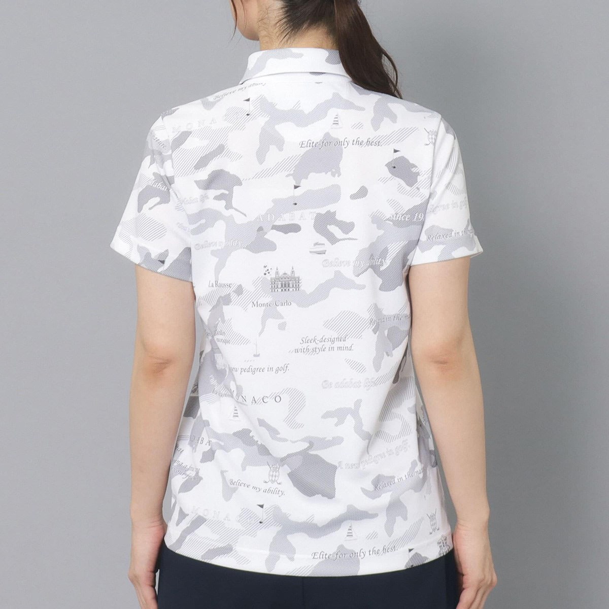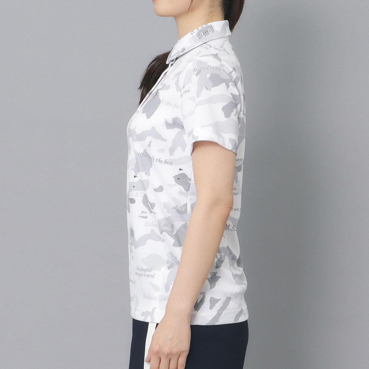 同系色で描かれたゴルフマップのグラフィックデザインがアクセントになる半袖ポロシャツ。