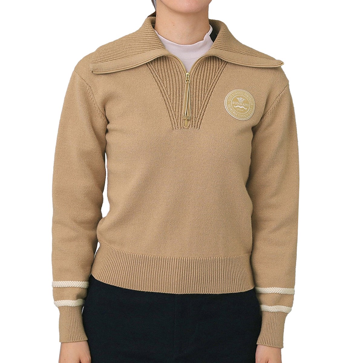 デザイン性と機能性を兼ね備えたこのハーフジップニットは、冬のゴルフコーディネートにぴったりです。