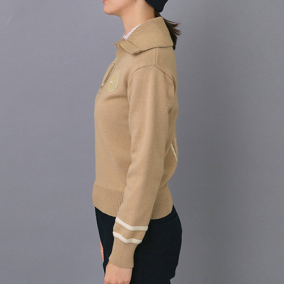 このハーフジップニットは、カレッジスポーツテイストを取り入れたデザインが特徴で、ゴールドファスナーや別珍引手が上品さを演出しています。