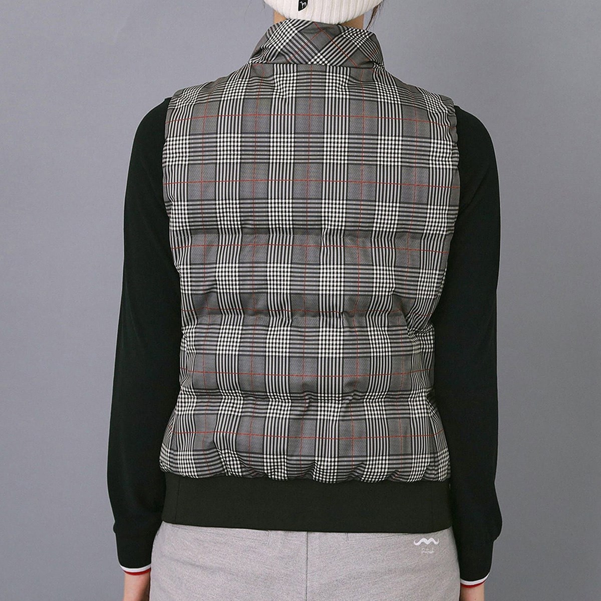 この中綿防寒ベストは、表地にグレンチェックをプリントした洗練されたデザインが特徴です。