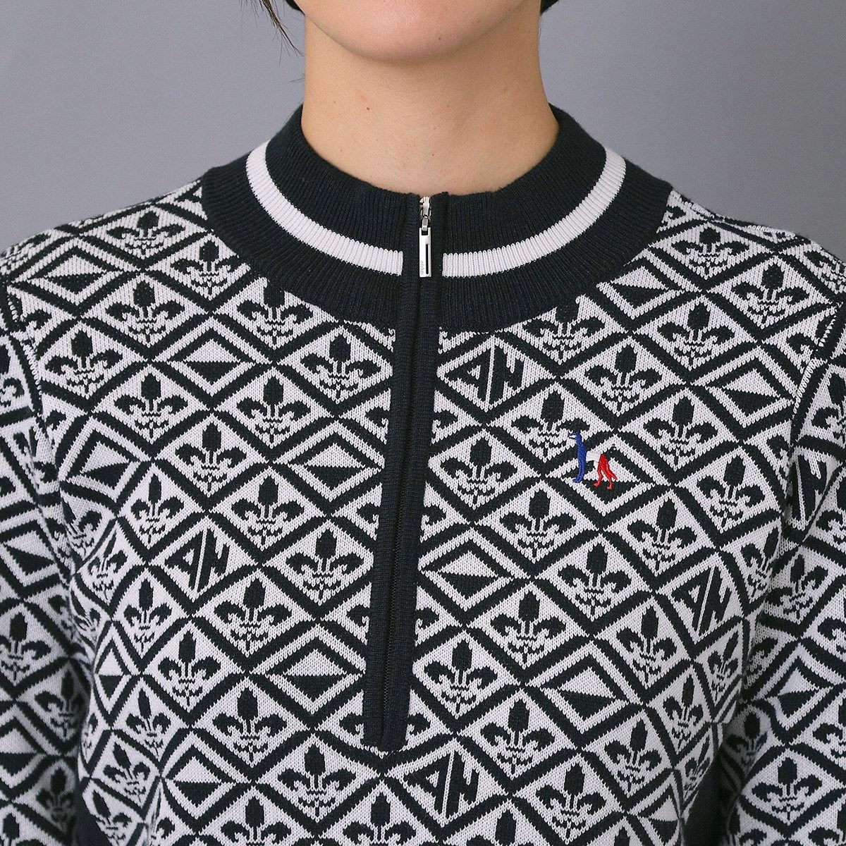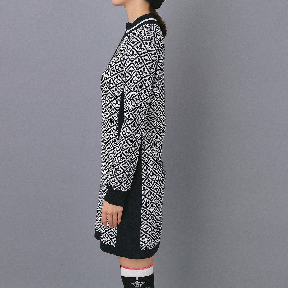 【リリー紋章総柄ジャカードが目を惹くハーフジップ・ニットワンピース】