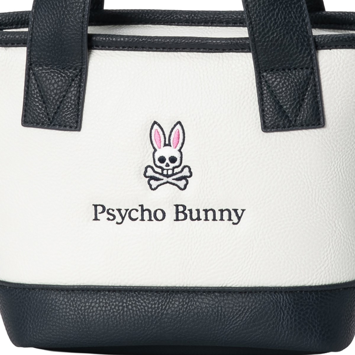 Psycho Bunnyの特徴であるピンクの耳のスカルバニーとロゴ刺繍が際立つラウンドトートバッグ。