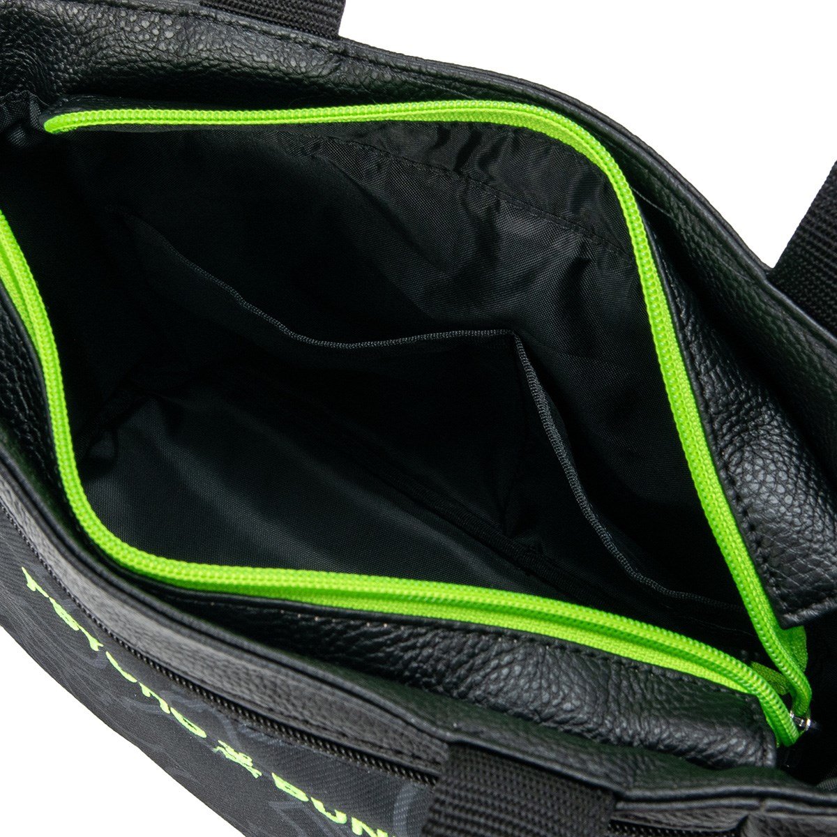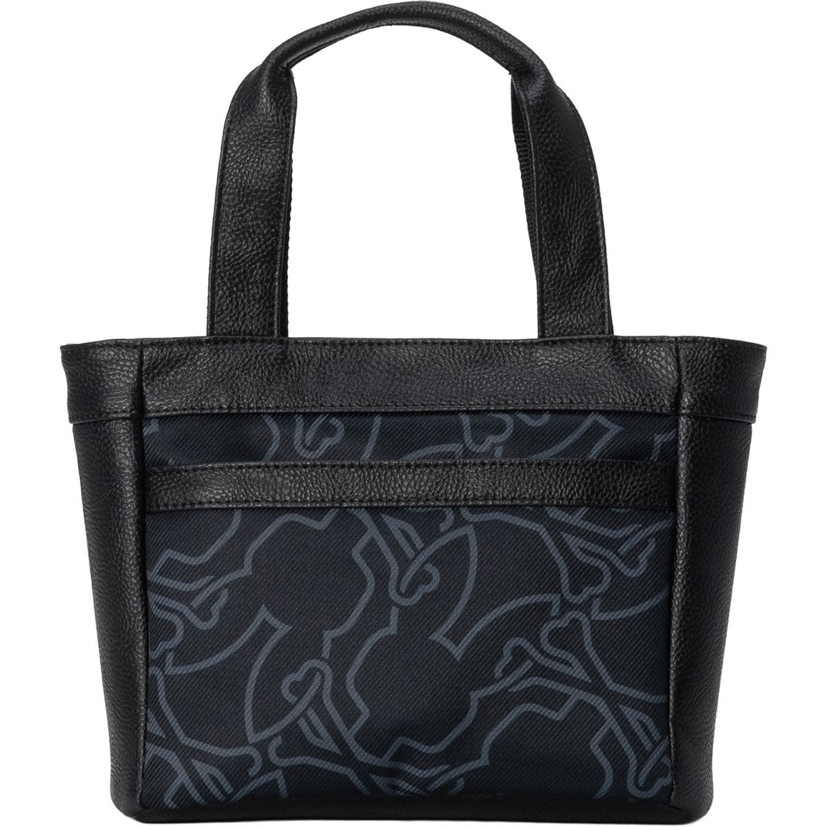 チェーンのように絡み合ったバニーがプリントされた厚手のツイル生地とレザーライクな合皮生地の組み合わせ。