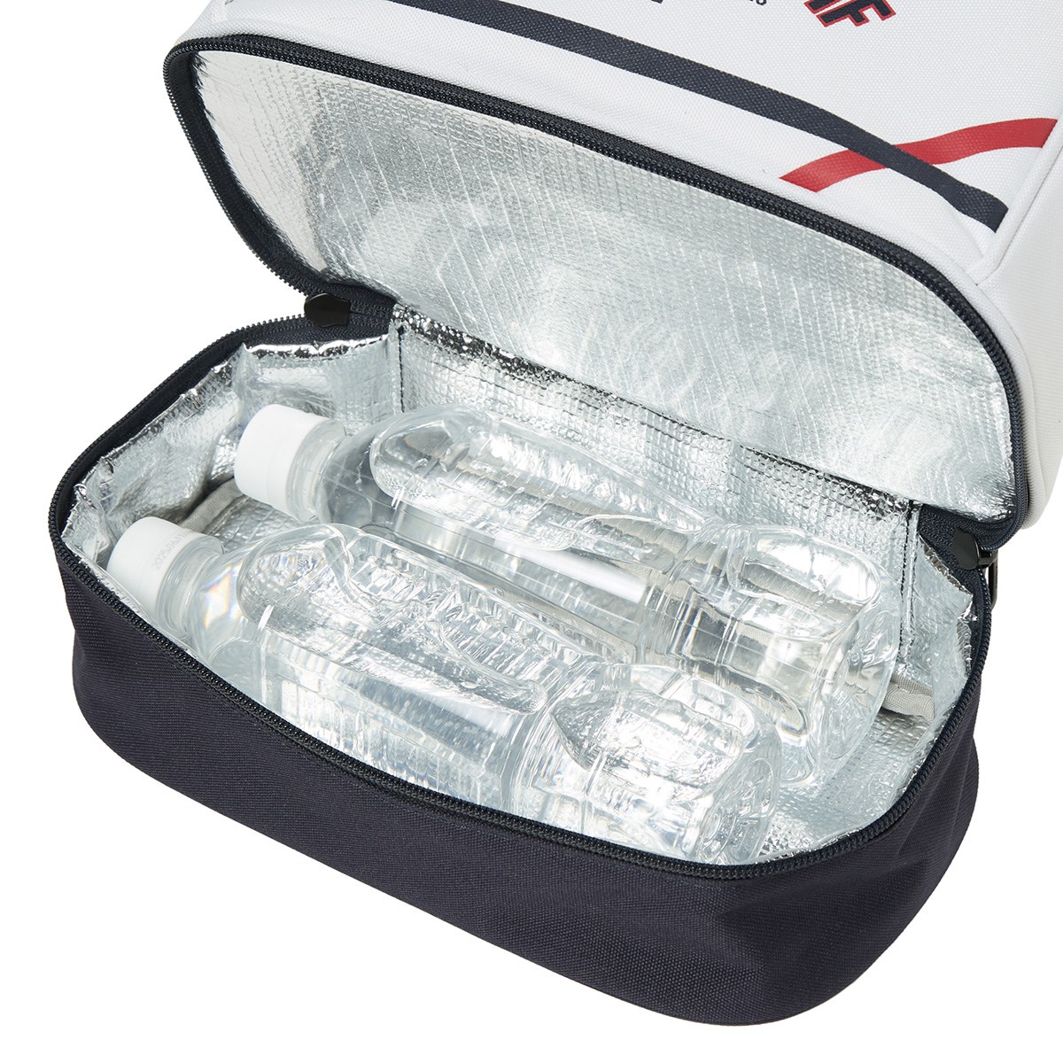 上部はラウンド中の小物入れ、下部は保冷機能裏地で500ml2本程度のペットボトルやクーリングアイテムを収納可能。