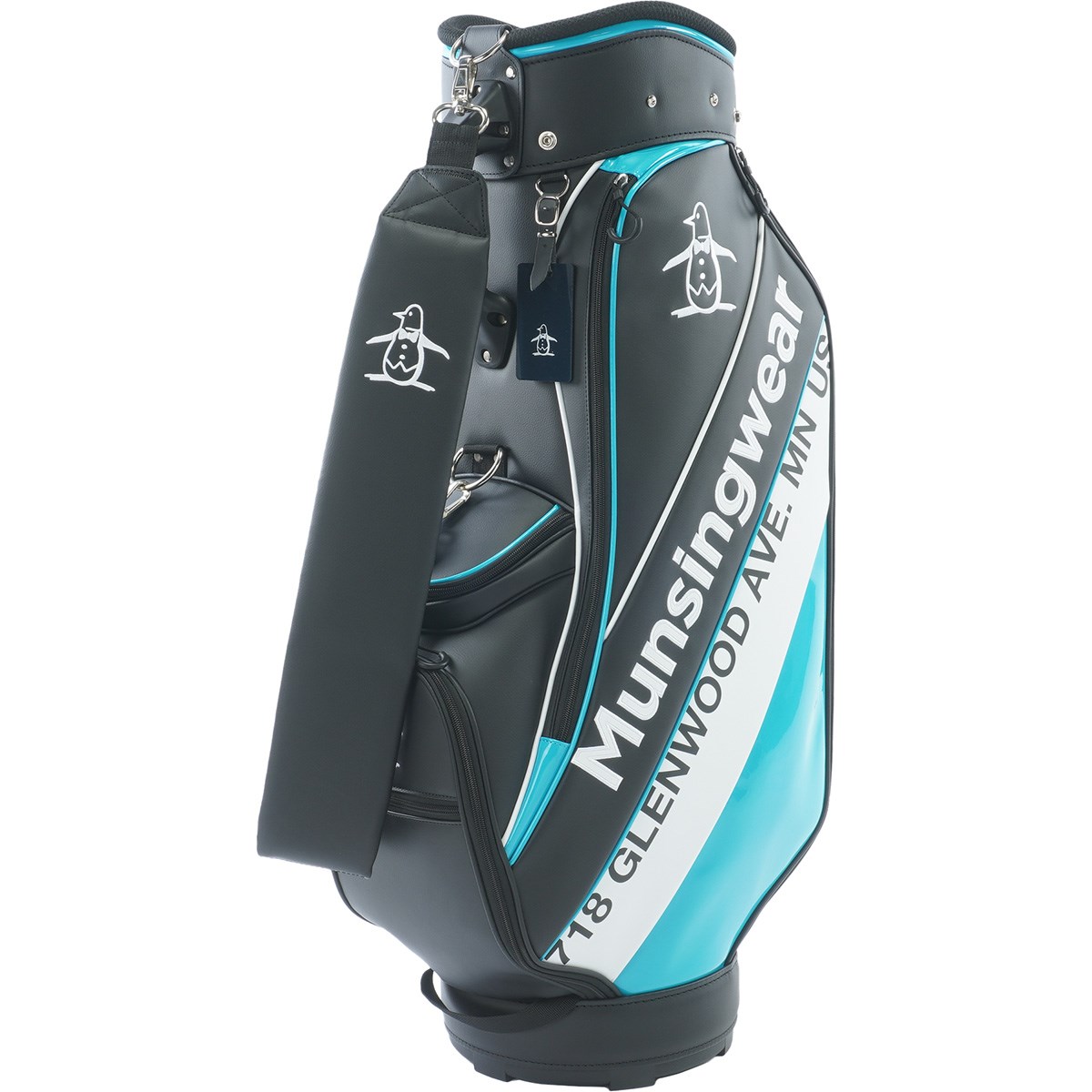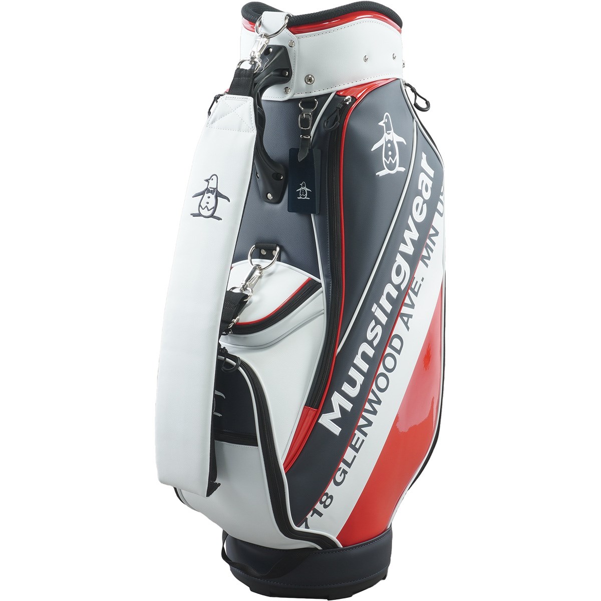 合成皮革の他にエナメル素材を使用した異素材感と、トリコロール配色がマンシングウェアらしいキャディバッグです。