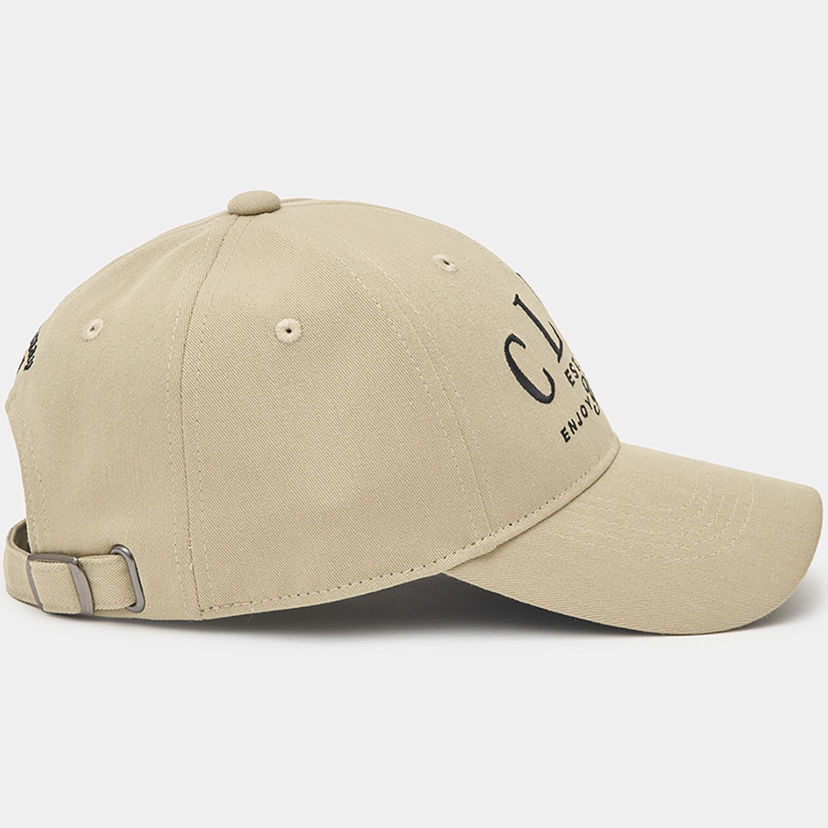 異なるフォントを組み合わせたフロント刺繍と定番のコットン系の素材、背面のメタルアジャスターがクラシックな雰囲気を演出。