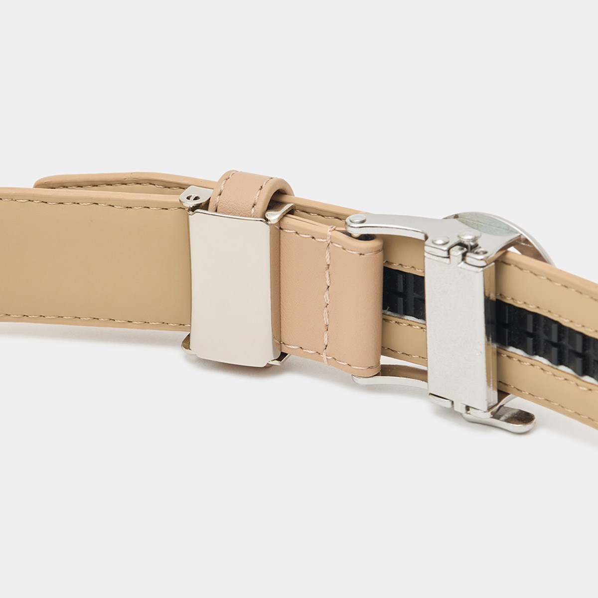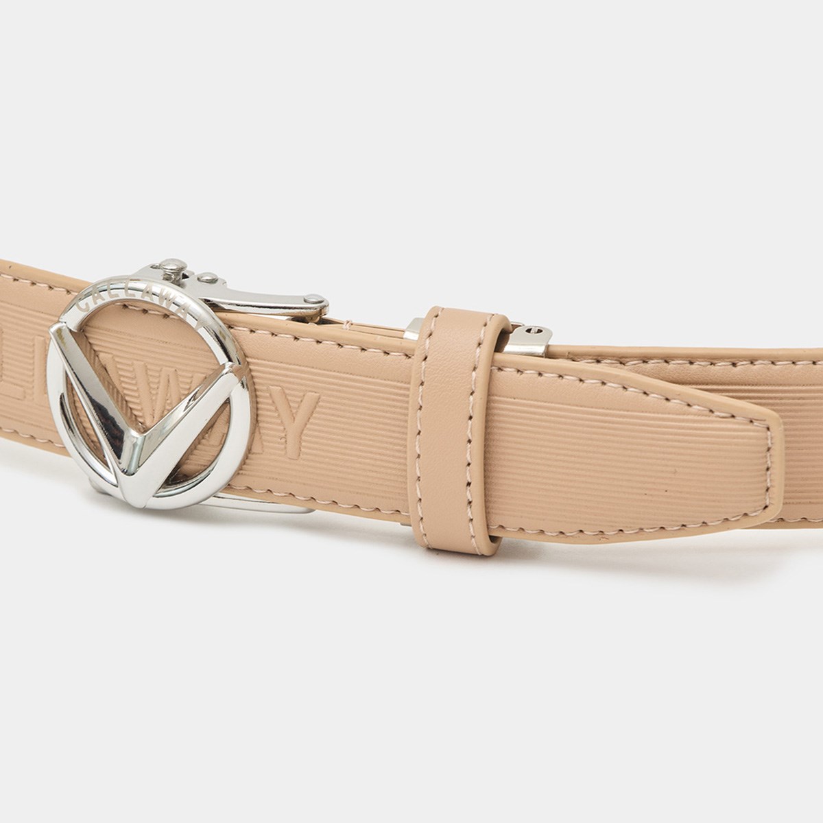 品のあるシルバーVバックルがポイントになった合成皮革セレーションベルト。