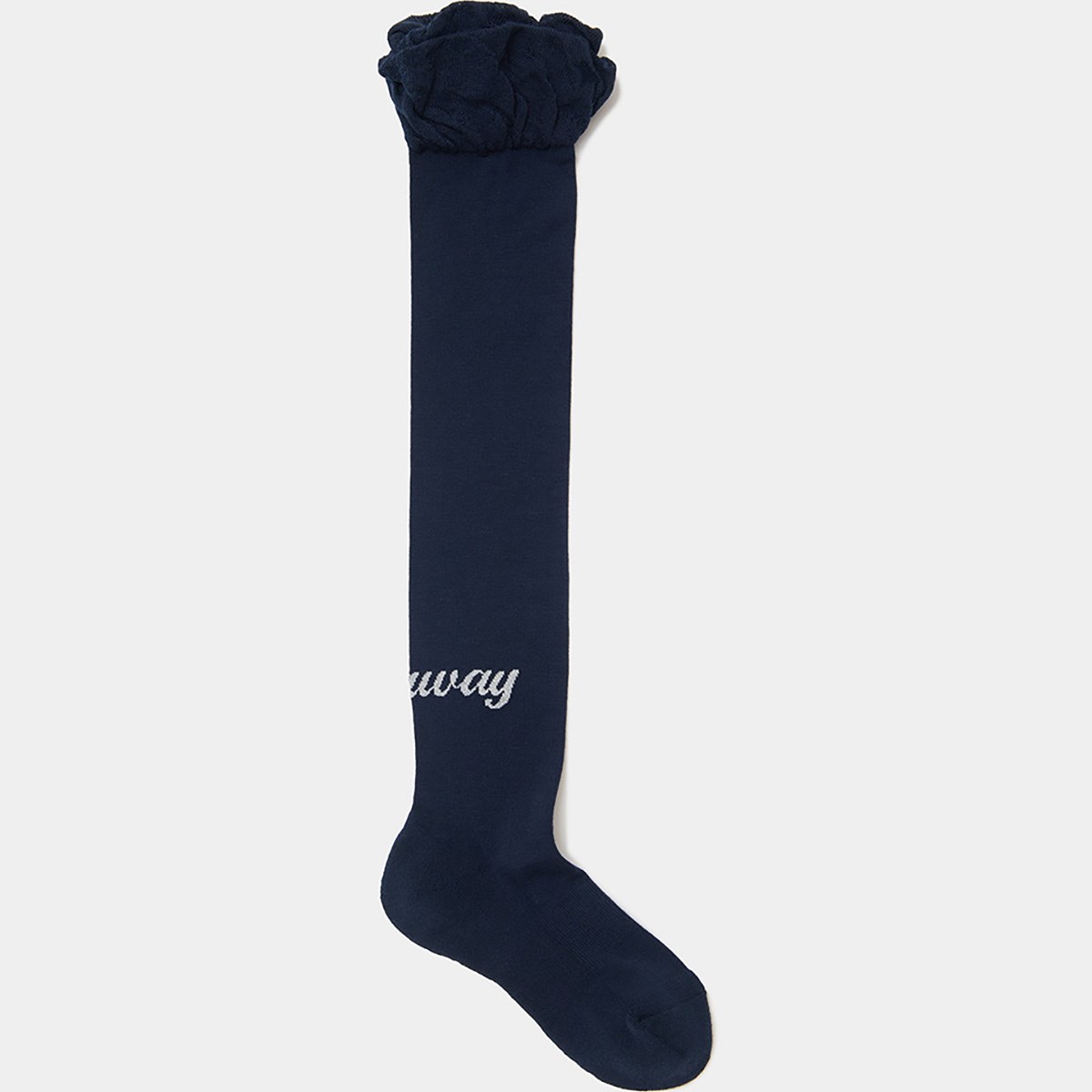 ベーシックカラーでのデザインをスポーツテイストに落とし込んだフェミニンでモードな2重フリルニーハイソックス。