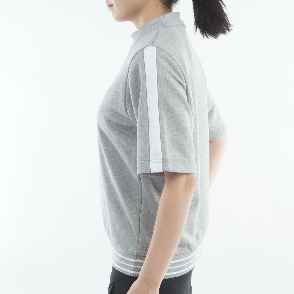 裏毛素材使用の半袖ハイネックのスウェットプルオーバー。