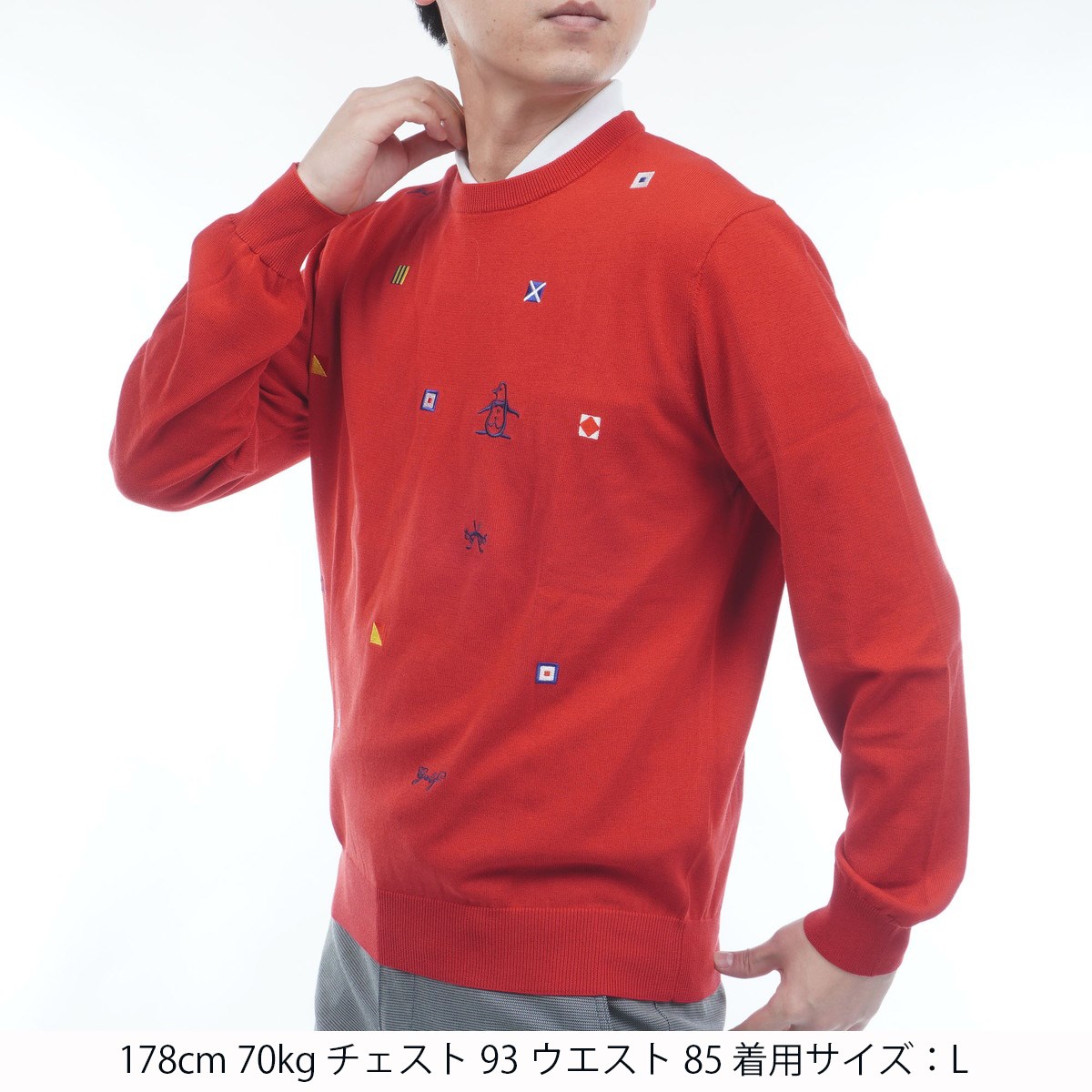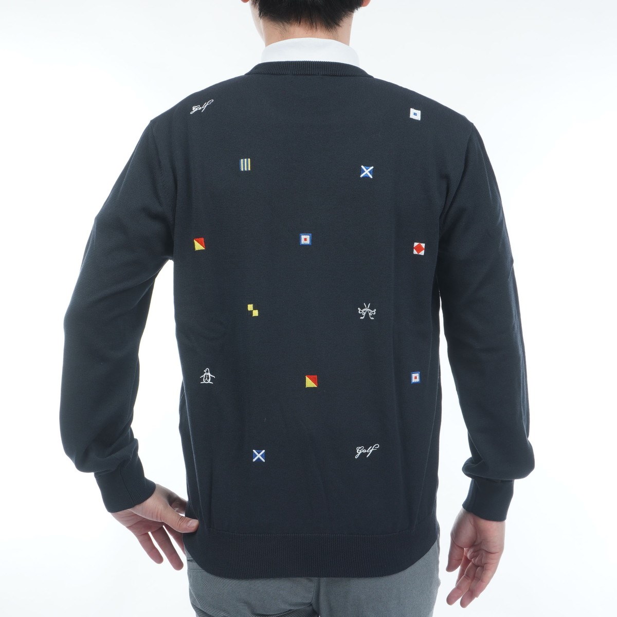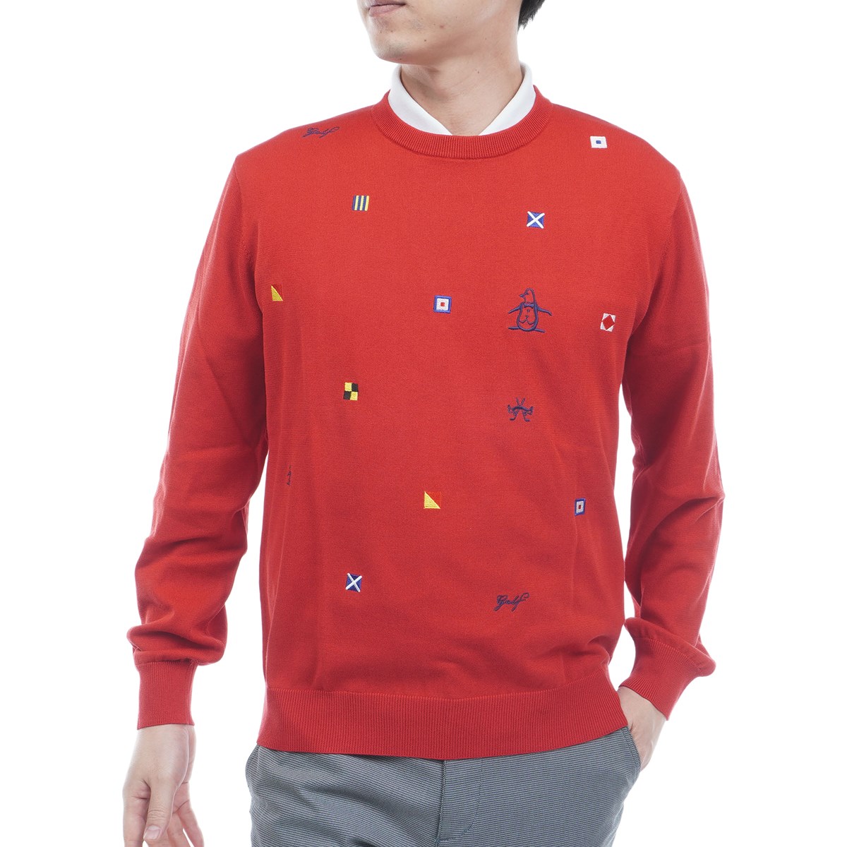 旗信号のM.S.G.W G.O.L.Fの文字を刺繍で表現したクルーネックセーター。