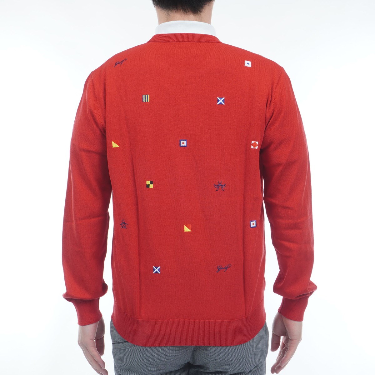 旗信号のM.S.G.W G.O.L.Fの文字を刺繍で表現したクルーネックセーター。