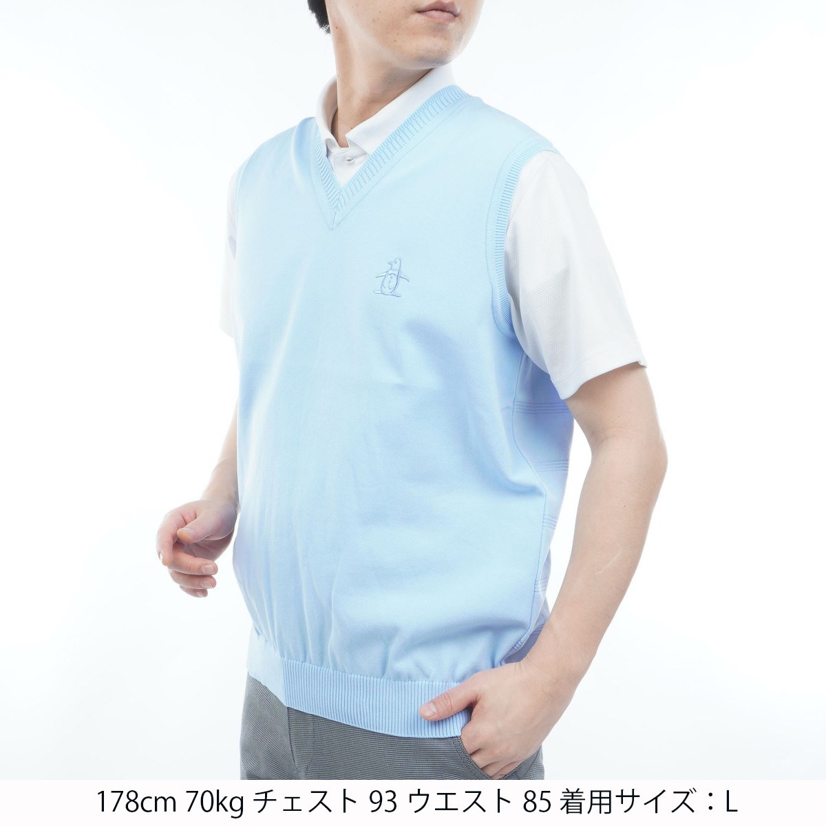 マンシングウェア Munsingwear 背面地柄ボーダーVネックベスト 3L サックス 00