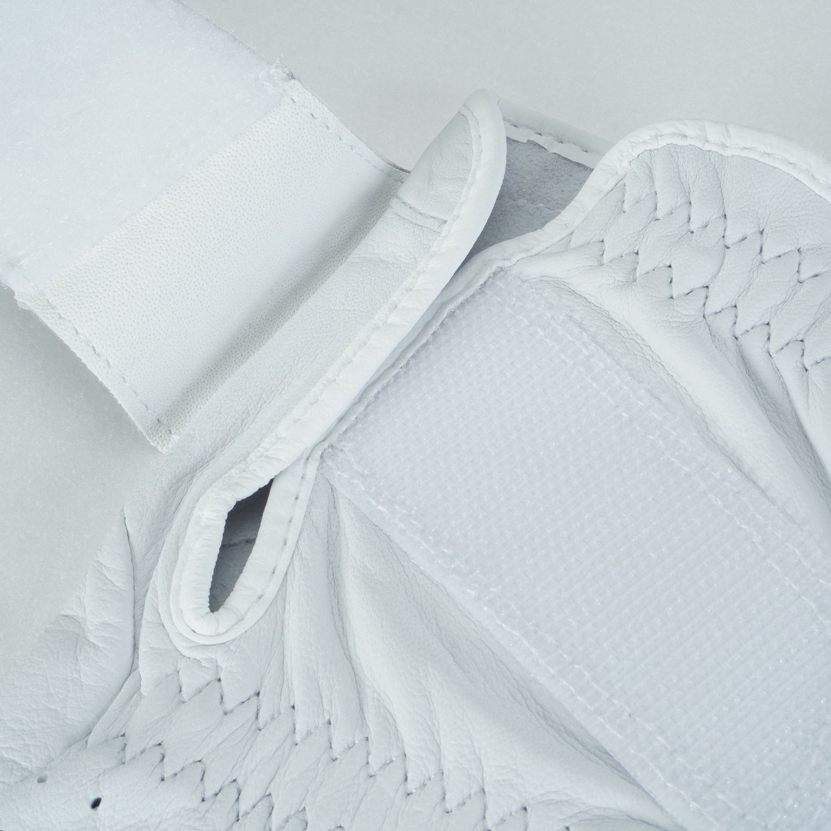 フラップの長さは一般的なグローブの倍以上の長さがあり、小指の外側を回って甲で接着されることにより、非常に強いフィット感をもたらす。