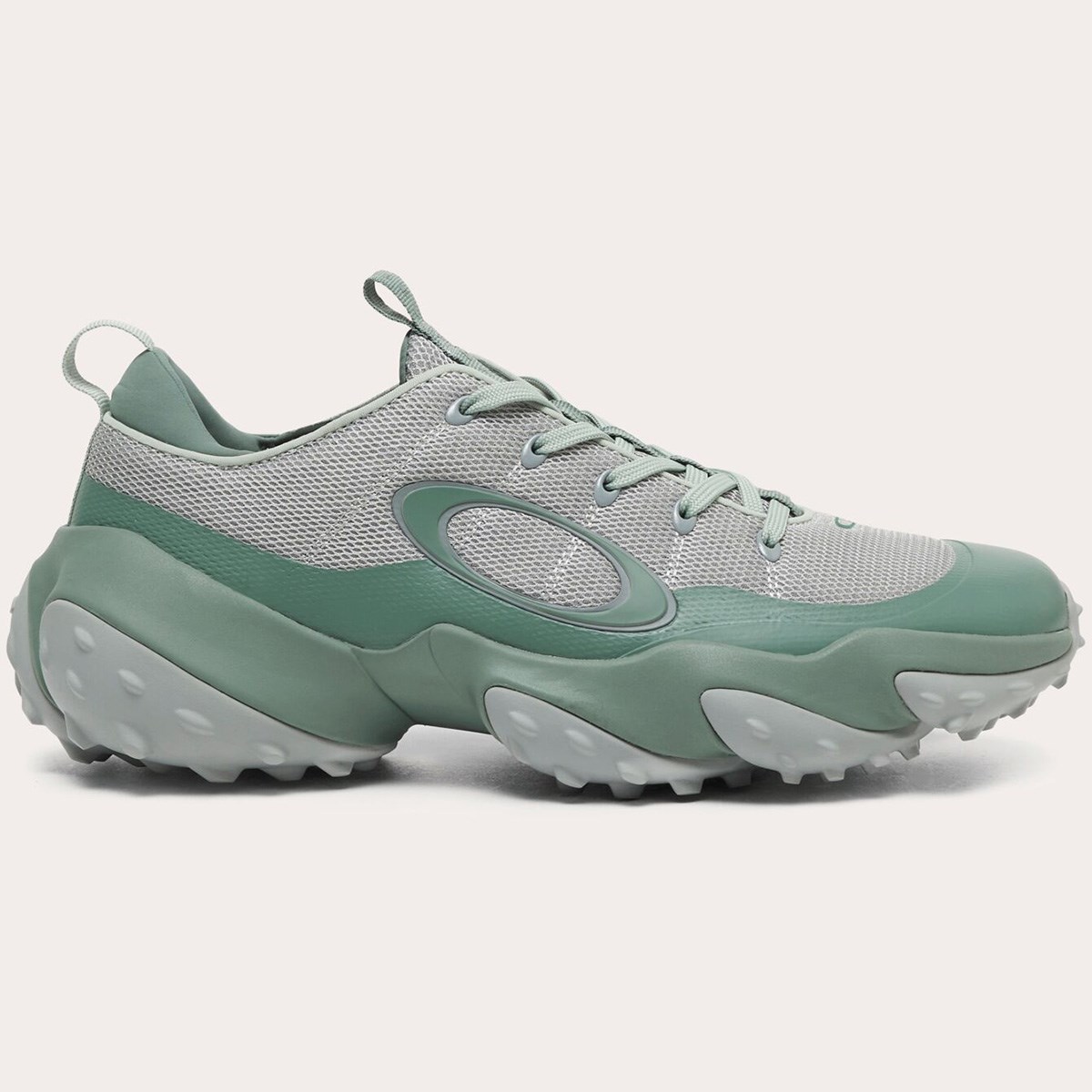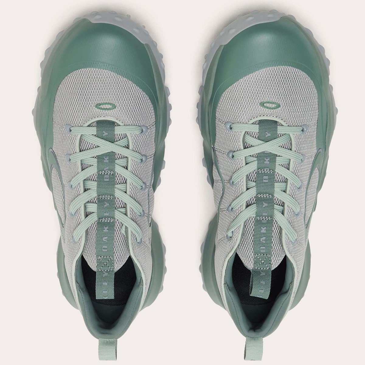 サイド、ヴァンプ、そしてトレッドに大胆な射出成形のエリプスロゴを配置し、ヒールウェビングとタンテープにはオークリーバークロゴがあしらわれています。