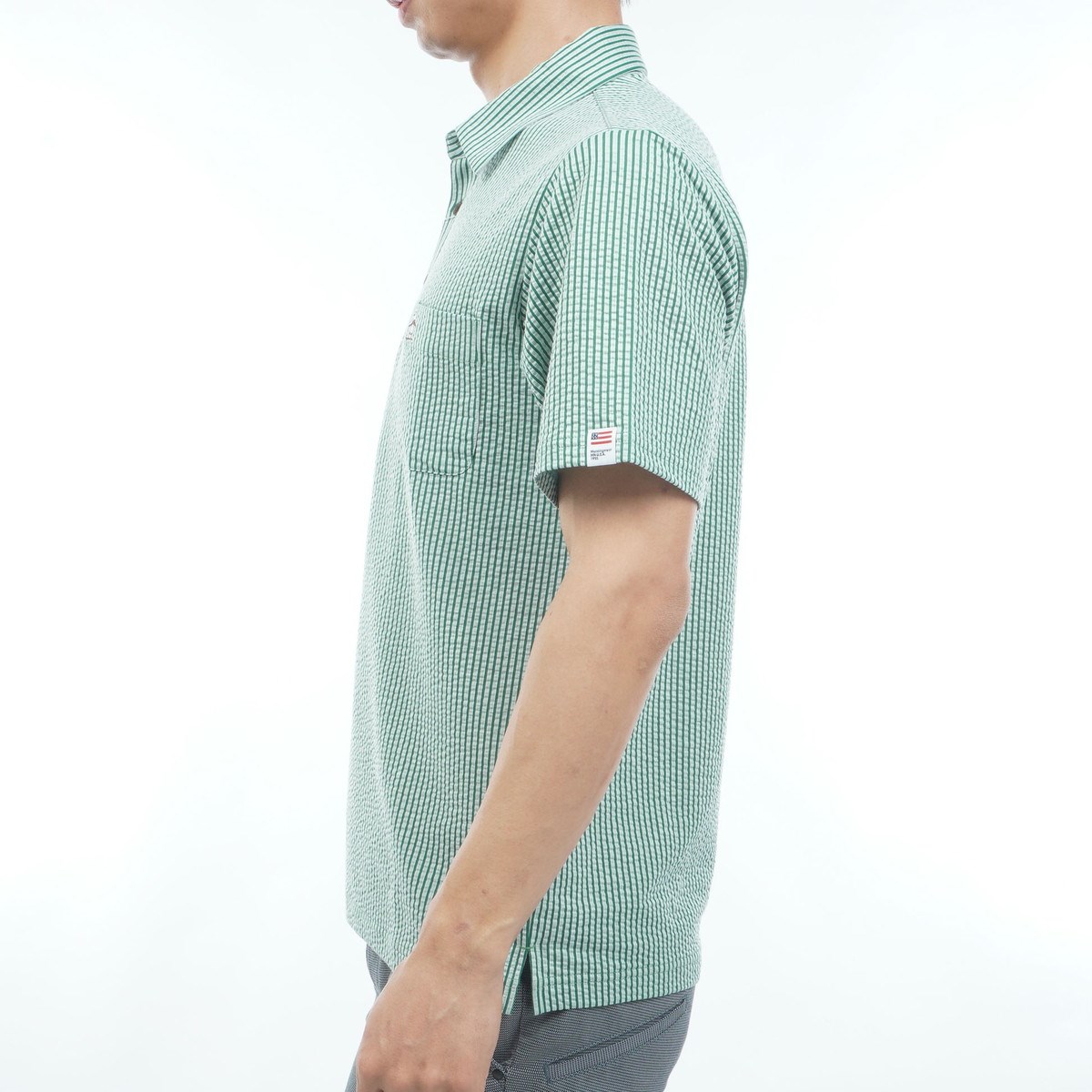 ・肌離れの良いシアサッカー素材を採用した、台襟付きの半袖ポロシャツです。
