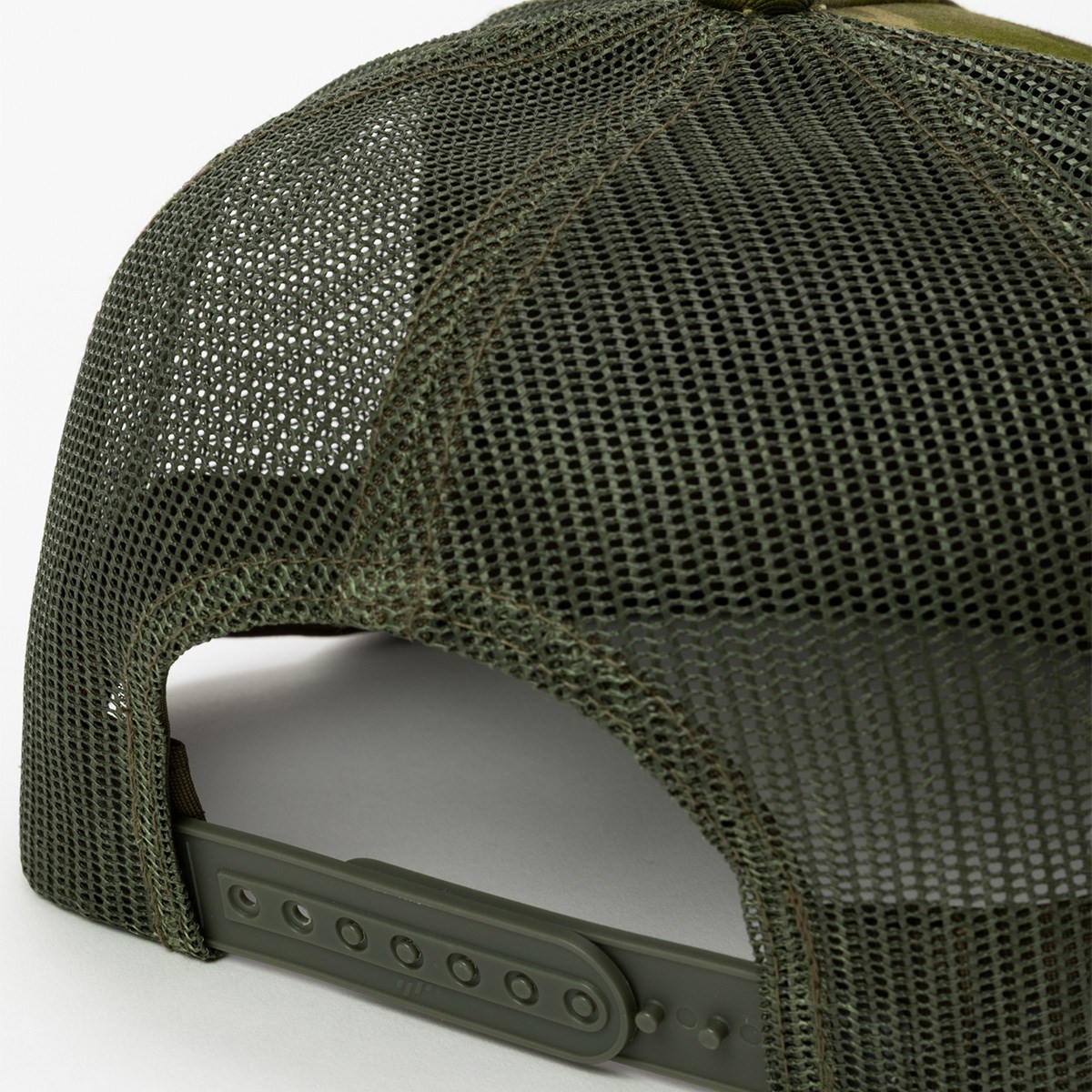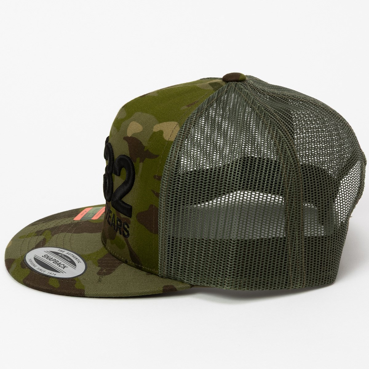 フロントに施されたSYロゴとカモフラージュ柄が印象的なメッシュキャップ。