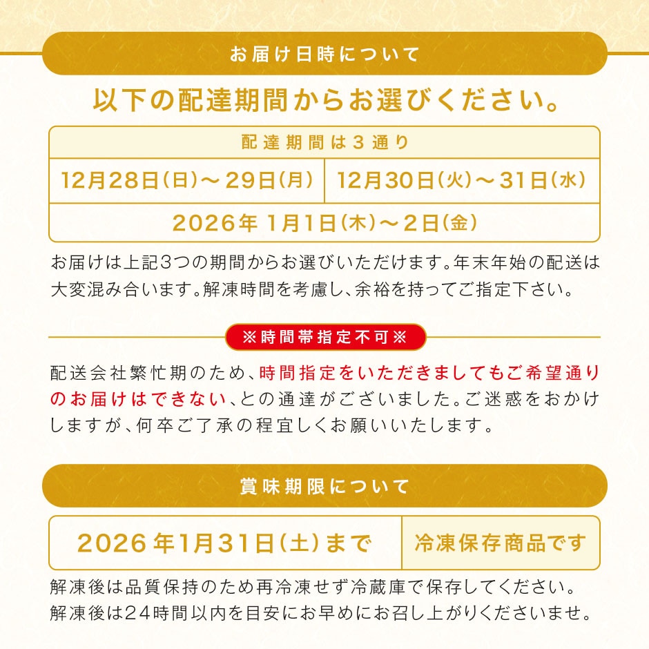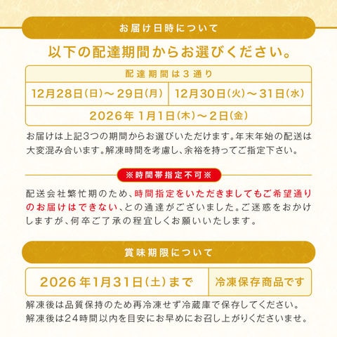 | 賞味期限 | 冷凍保存で2026.1.31 ※解凍後は品質保持のため、再冷凍せず冷蔵庫で保存して下さい。 また、賞味期限に関わらずお早めにお召し上がり下さい。 |