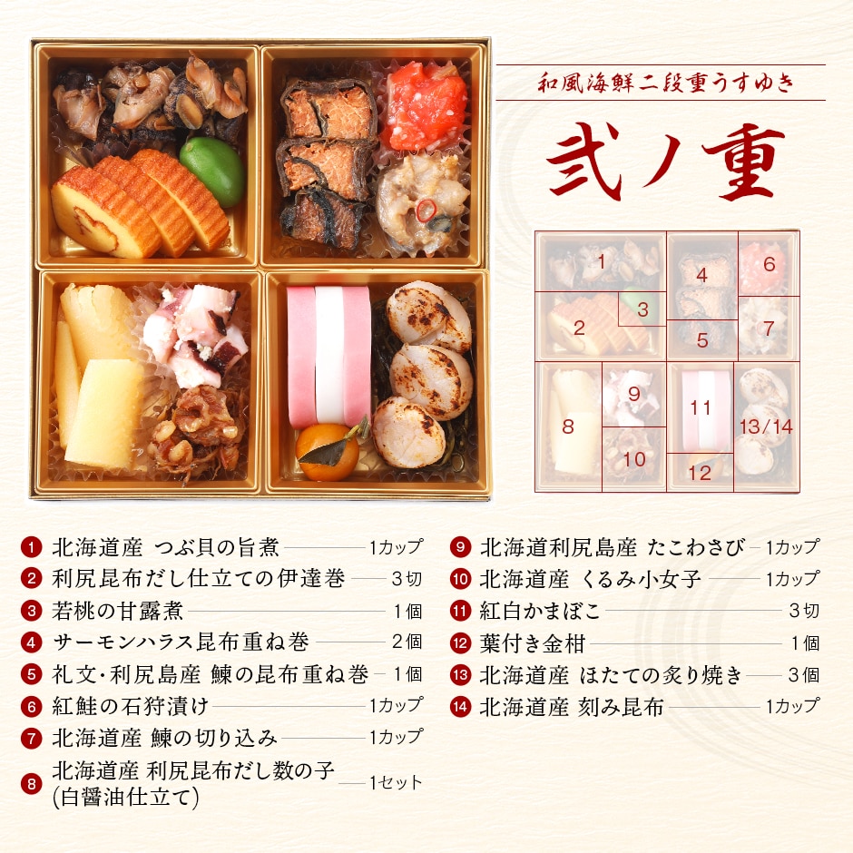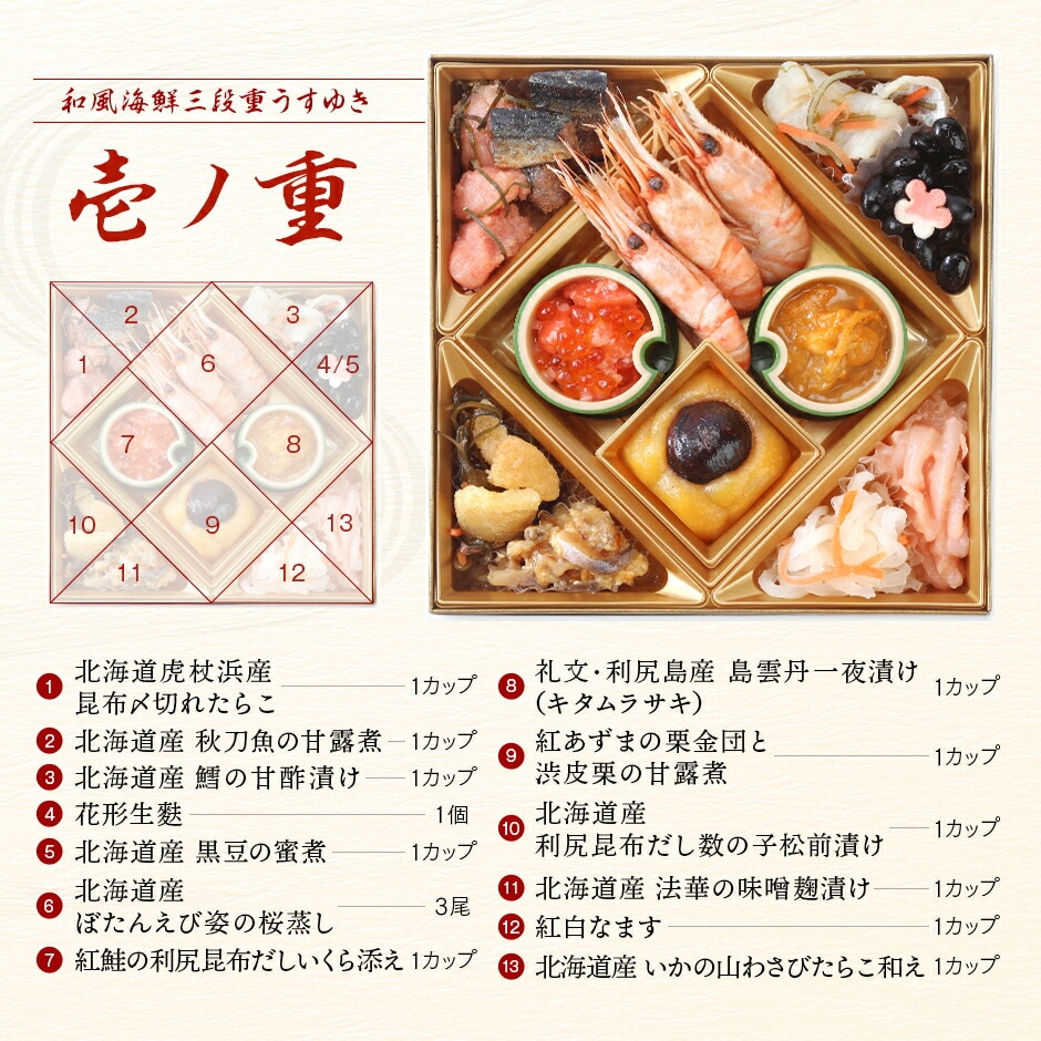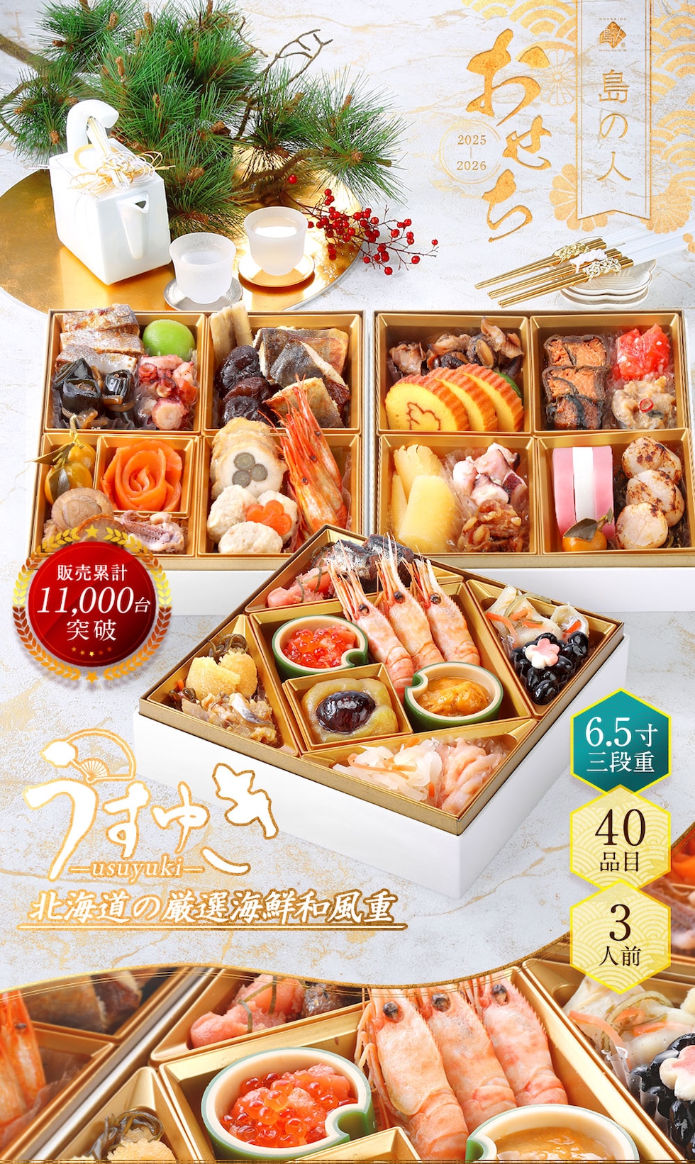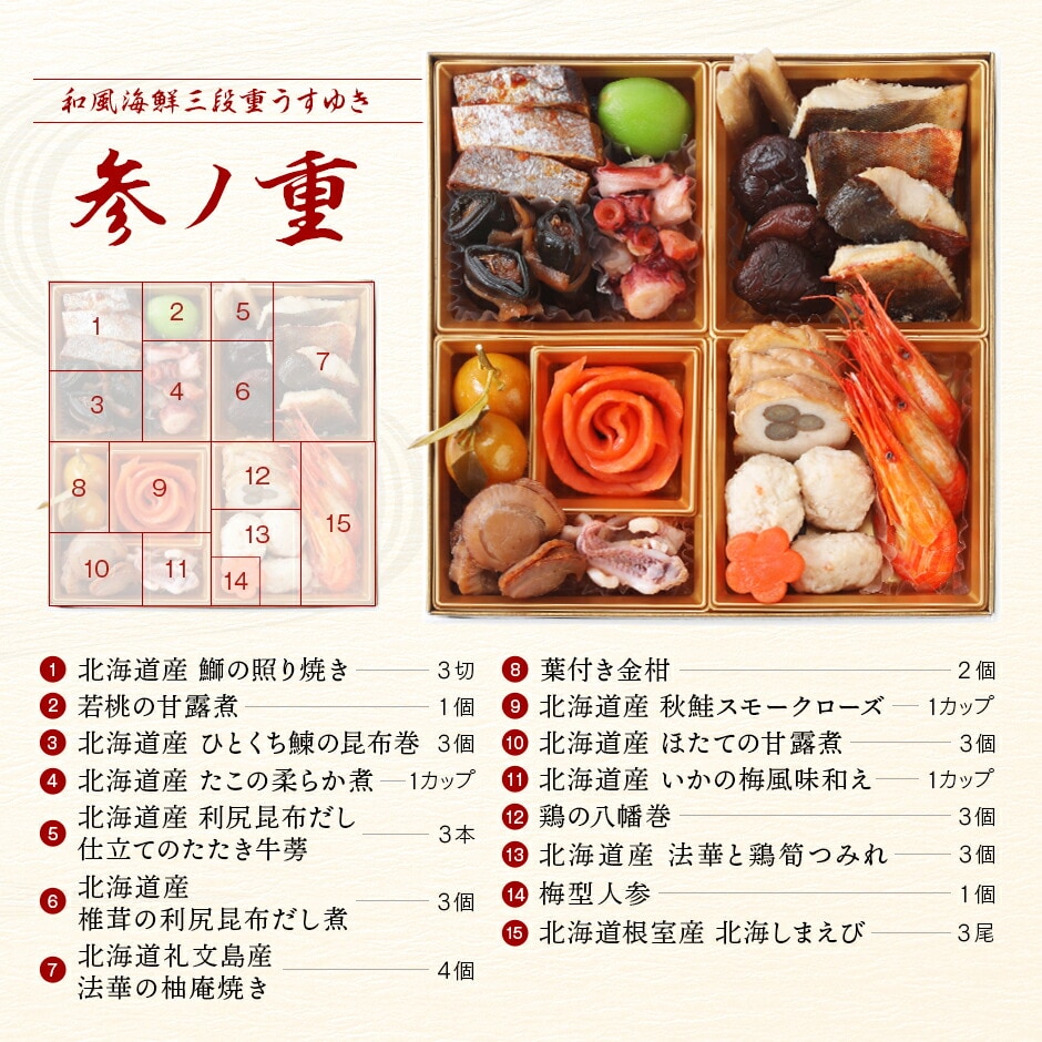 【先着700円OFFクーポン対象】北海道の高級海鮮おせち 三段重 6.5寸 全40品目 3人前「うすゆき」 冷凍 【送料無料】【12月30~31日お届け】【"島の人_定番おせち"】[cd*]A70-01301-11131