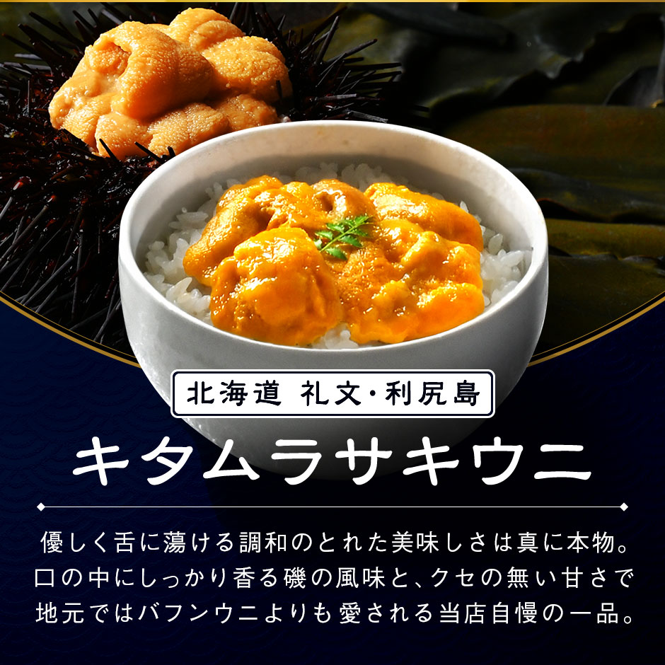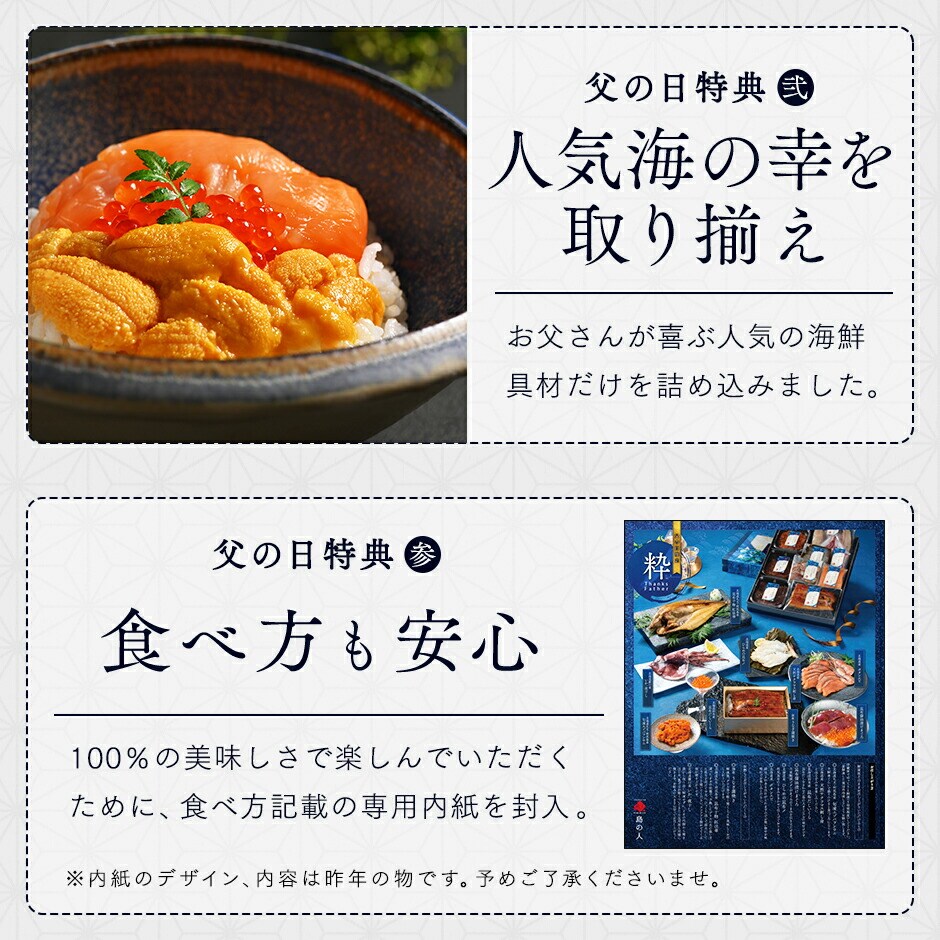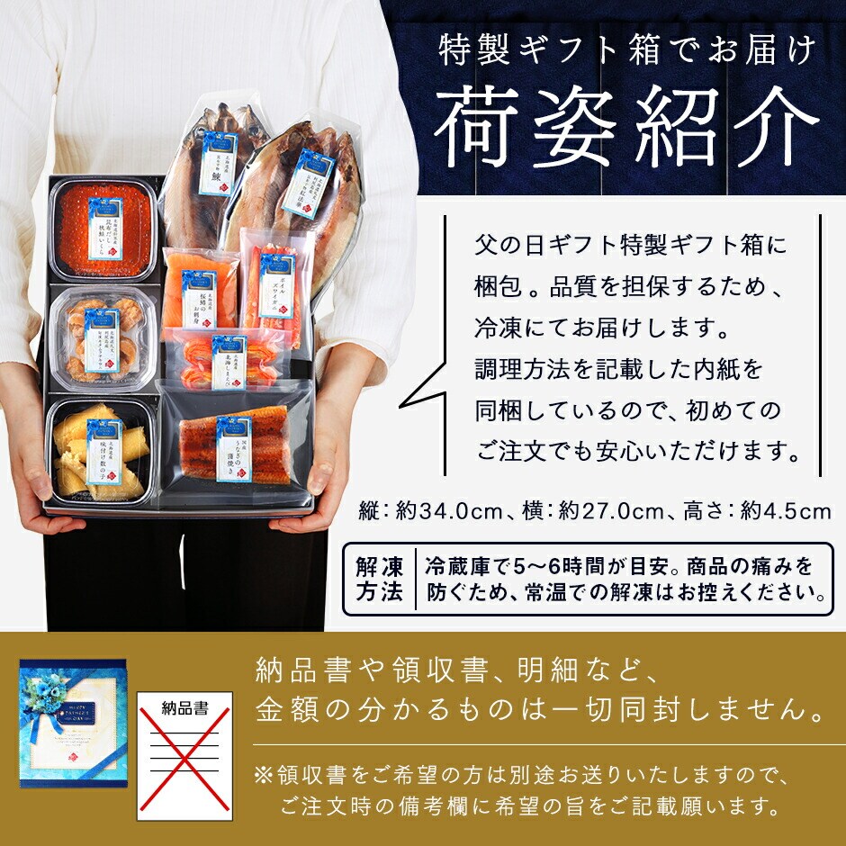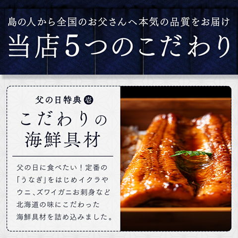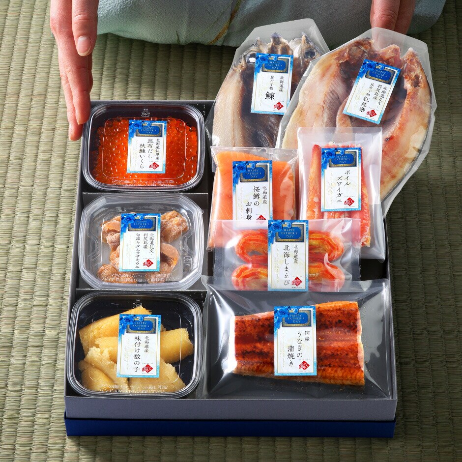 【父の日限定 うなぎ入り海鮮グルメ9点セット】【化粧箱入り】 ※専用のギフト箱にいれてお届けします。 ● 礼文・利尻島産 旬凍キタムラサキウニ 40g ● 斜里産 昆布だしいくら(秋鮭) 50g ● 北海道産 味付け数の子(折れ子) 70g ● 礼文・利尻島産 昆布干物 紅法華 中(200-290g) 1枚 ● 北海道産 昆布干物 鰊 ● 北海道産 天然サクラマス刺身(柵) 100g ● 北海道産 北海しまえび 4尾 ● ボイルズワイガニポーション 4本 ● 国産 うなぎ蒲焼きハーフサイズ 1枚 うなぎ蒲焼きと紅法華、鰊の3点は必ず加熱してお召し上がりください。 ※詳しい解凍方法・お召し上がり方に関しては商品に同封させて頂いておりますので、ご安心くださいませ。 ◆ アレルゲン:えび・かに・小麦・いくら・さけ・大豆 原材料:商品ラベルに記載 保存料:不使用 ※お熨斗、メッセージカードはお付けできません。予めご了承ください。 | |