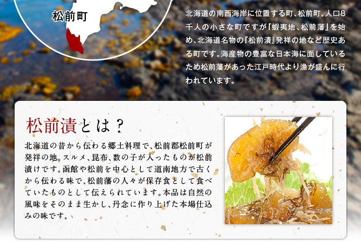 | 原材料 | 松前漬(砂糖、醤油、するめいか、昆布、利尻昆布エキス、米発酵調味料、魚介エキス、昆布エキス、酵母エキス、唐辛子)、味付数の子(ニシンの卵(カナダ産)、その他)/調味料(アミノ酸等)、ソルビトール、酒精、酸味料、ビタミンB1、(一部に小麦・大豆・いか・魚介エキス(魚介類)を含む) |