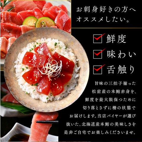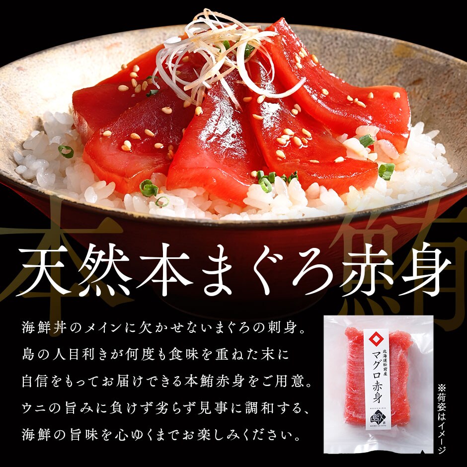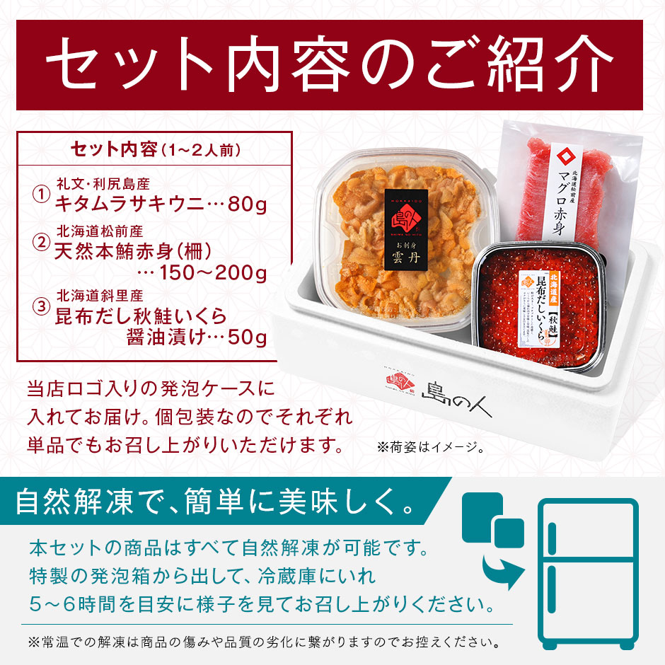 島の人の海鮮丼セット 〇礼文・利尻島産 旬凍キタムラサキウニ 80g 〇松前産 本まぐろ 赤身 柵150-200g 〇斜里産 昆布だし鮭いくら 50g ※本まぐろは柵の状態でお届けいたします。 ※ページ上の解凍時間はあくまで目安となります。 商品の状態を見ながら解凍してください。 ※解凍後はお早めにお召し上がりください。 | |