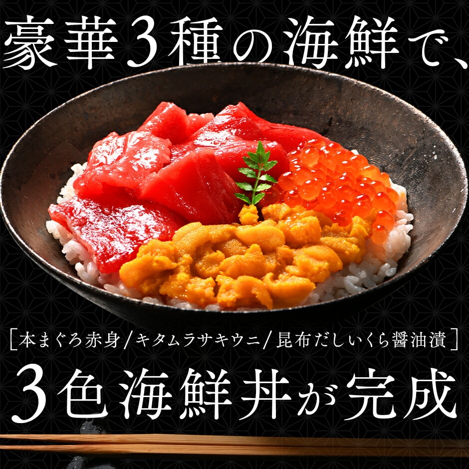 海鮮丼 素材にこだわる海鮮3種丼セット【送料無料】 礼文島産 キタムラサキウニ 北海道松前産本まぐろ赤身 北海道 斜里産 鮭イクラ[cd*]A01-04055-11330