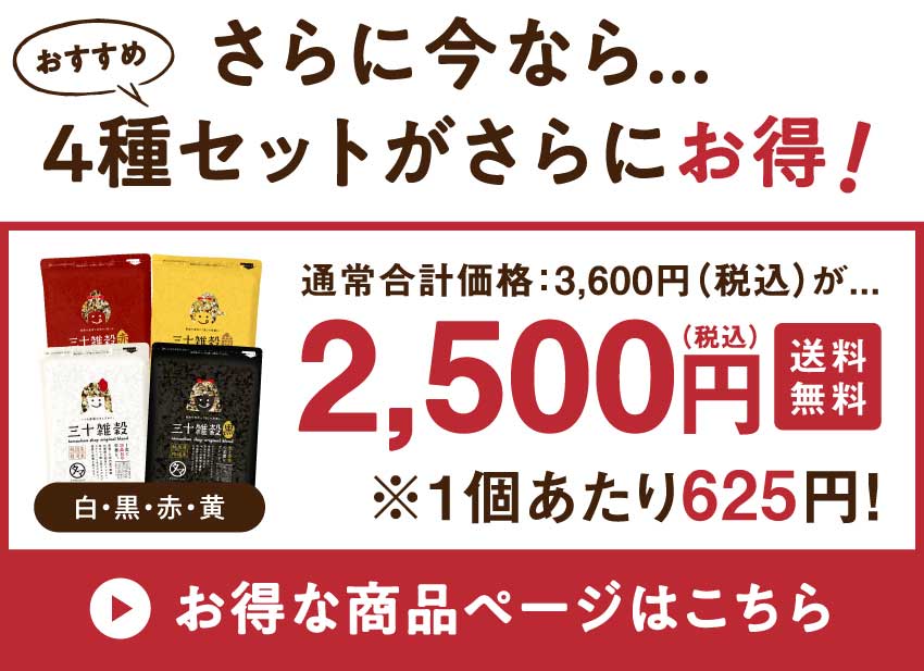 もち麦(国内製造)、胚芽押麦、丸麦、もち玄米、はだか麦、発芽もち黒米、発芽玄米、うるち玄米、発芽もち赤米、黒大豆(黒千石75%、黒豆25%)、米粒麦、発芽もち玄米、黄大豆、焙煎もち玄米、小豆、焙煎玄米、焙煎黄大豆、乾燥粒こんにゃく、たかきび、青大豆、発芽もち緑米、もちきび、寒天、もちあわ、はと麦、とうもろこし、ひえ、玄はと麦、もち黒米(紫こぼし100%)、手亡豆、なた豆