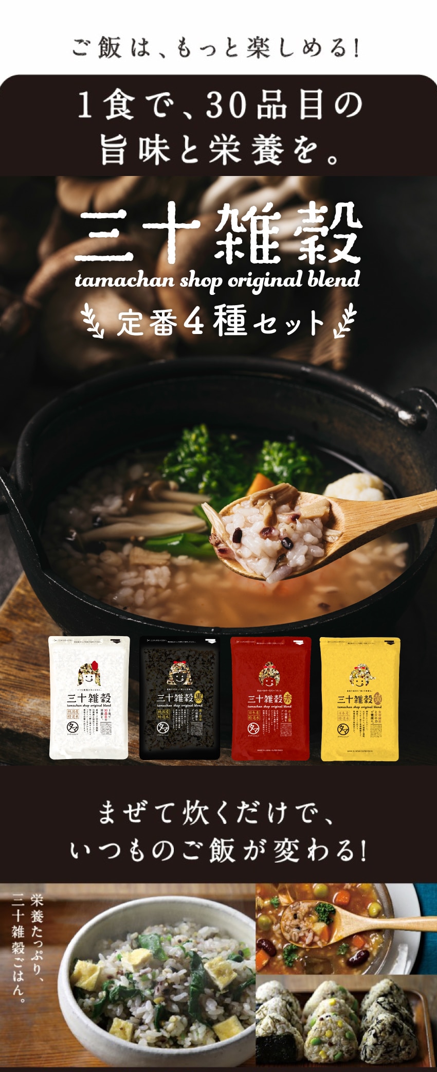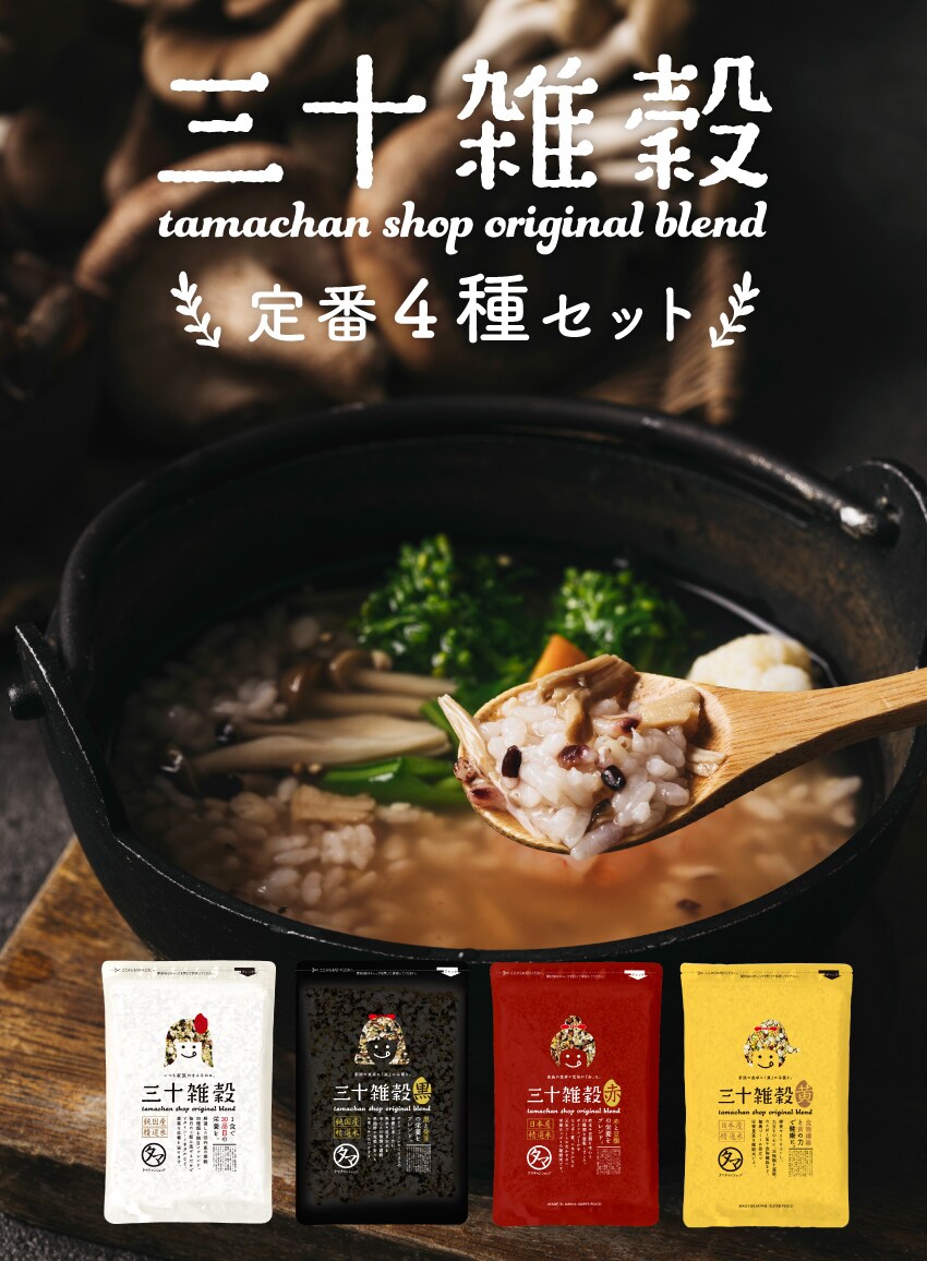 三十雑穀4袋セット(白・黒・赤・黄 各300g) タマチャンショップの30雑穀米 健康に役立つ栄養たっぷり「健康の黄」も入ったお得な4種セット【送料無料】 1日30品目の栄養を実現! 白米と一緒に炊くだけで、もちぷち美味しい栄養満点ごはん※計量スプーン1本付 11月20日より順次発送