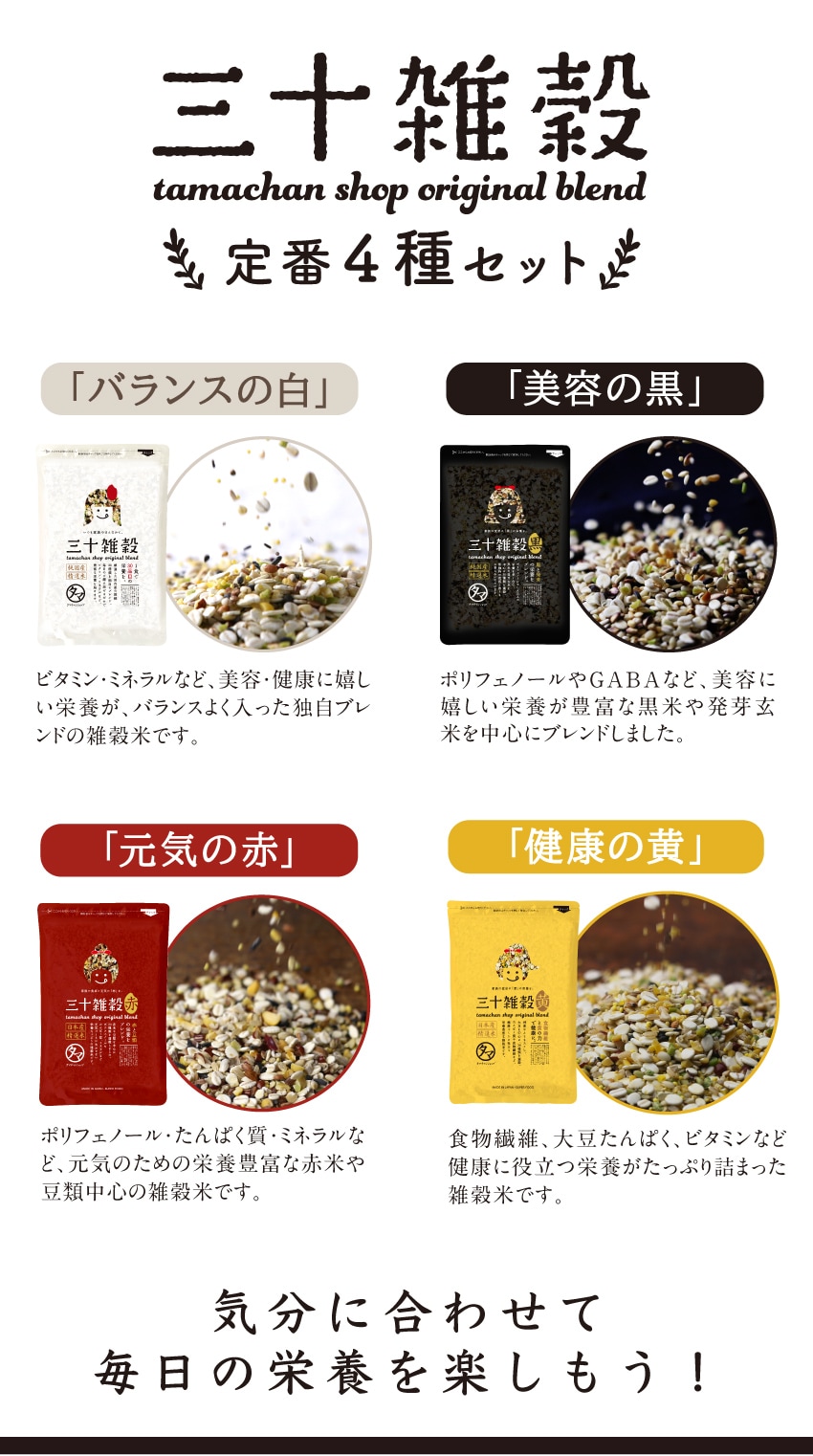 三十雑穀4袋セット(白・黒・赤・黄 各300g) タマチャンショップの30雑穀米 健康に役立つ栄養たっぷり「健康の黄」も入ったお得な4種セット【送料無料】 1日30品目の栄養を実現! 白米と一緒に炊くだけで、もちぷち美味しい栄養満点ごはん※計量スプーン1本付
