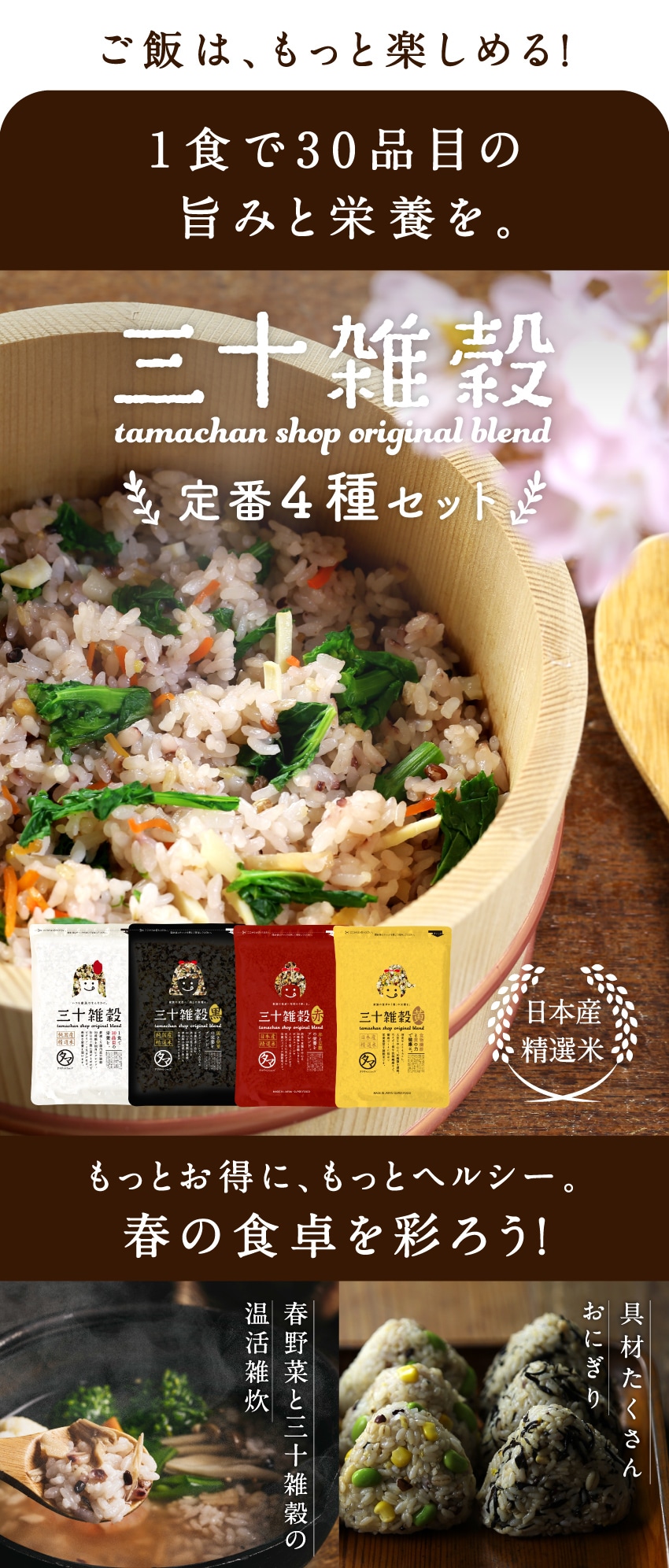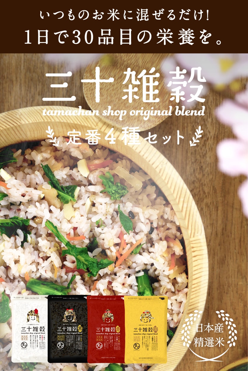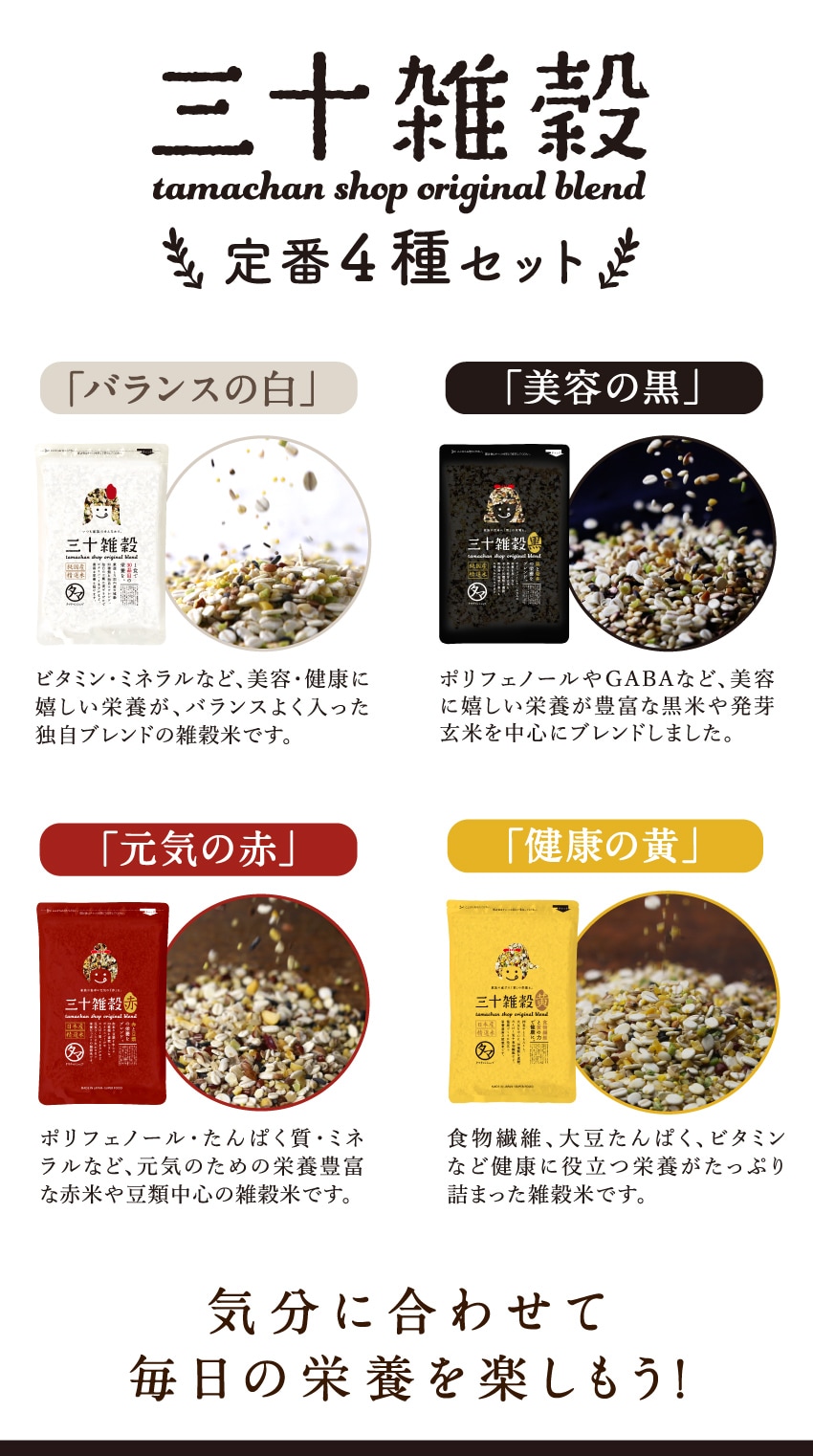 三十雑穀4袋セット(白・黒・赤・黄 各300g) タマチャンショップの30雑穀米 健康に役立つ栄養たっぷり「健康の黄」も入ったお得な4種セット【送料無料】 1日30品目の栄養を実現! 白米と一緒に炊くだけで、もちぷち美味しい栄養満点ごはん※計量スプーン1本付【1個迄メール便/2個~宅配便】