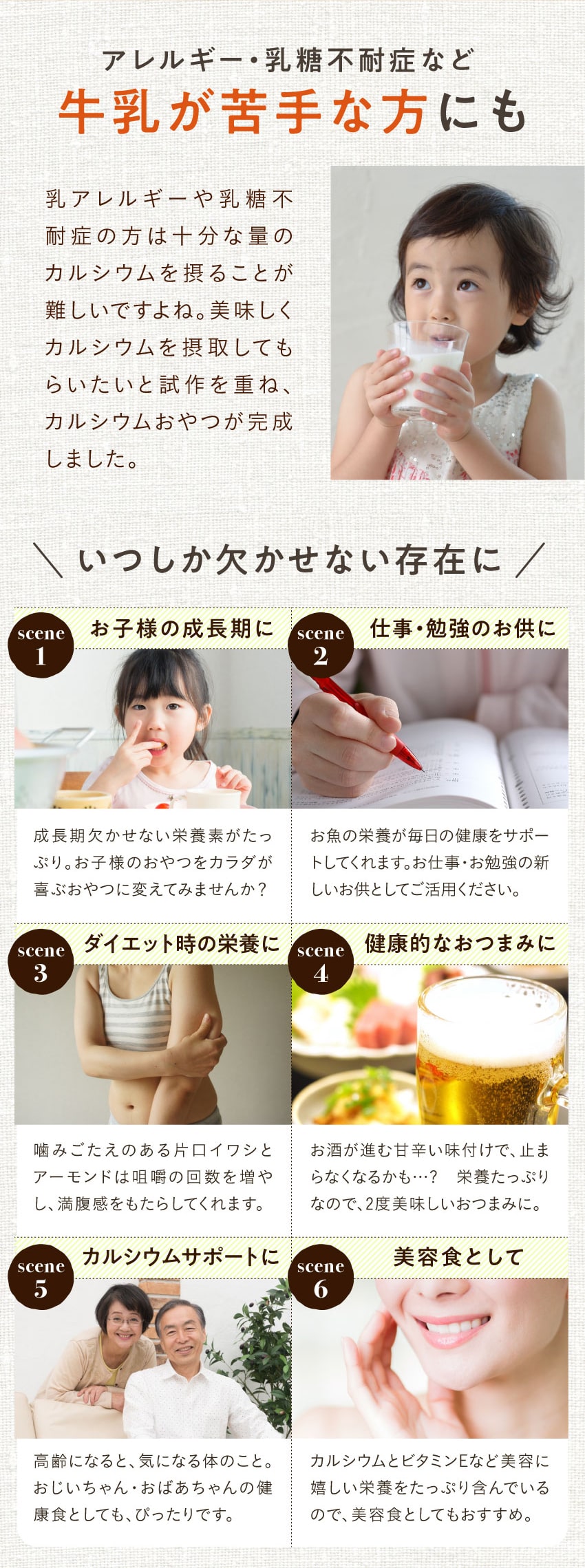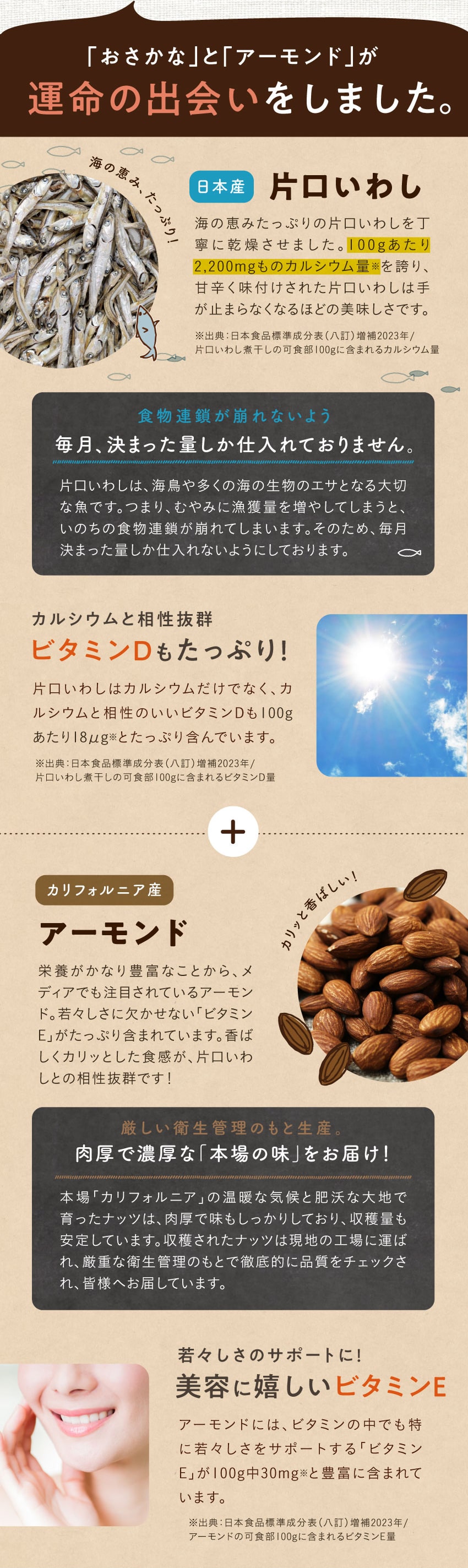 いわし煮干し(国内製造)、アーモンド(アメリカ産)、砂糖、白ごま、醤油、澱粉分解物、食塩/調味料(アミノ酸等)、(一部に小麦・大豆・ごま・アーモンドを含む)