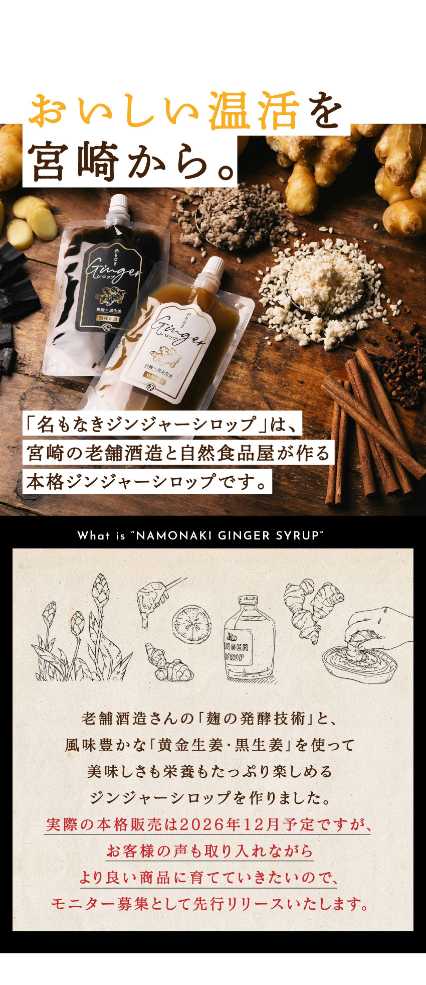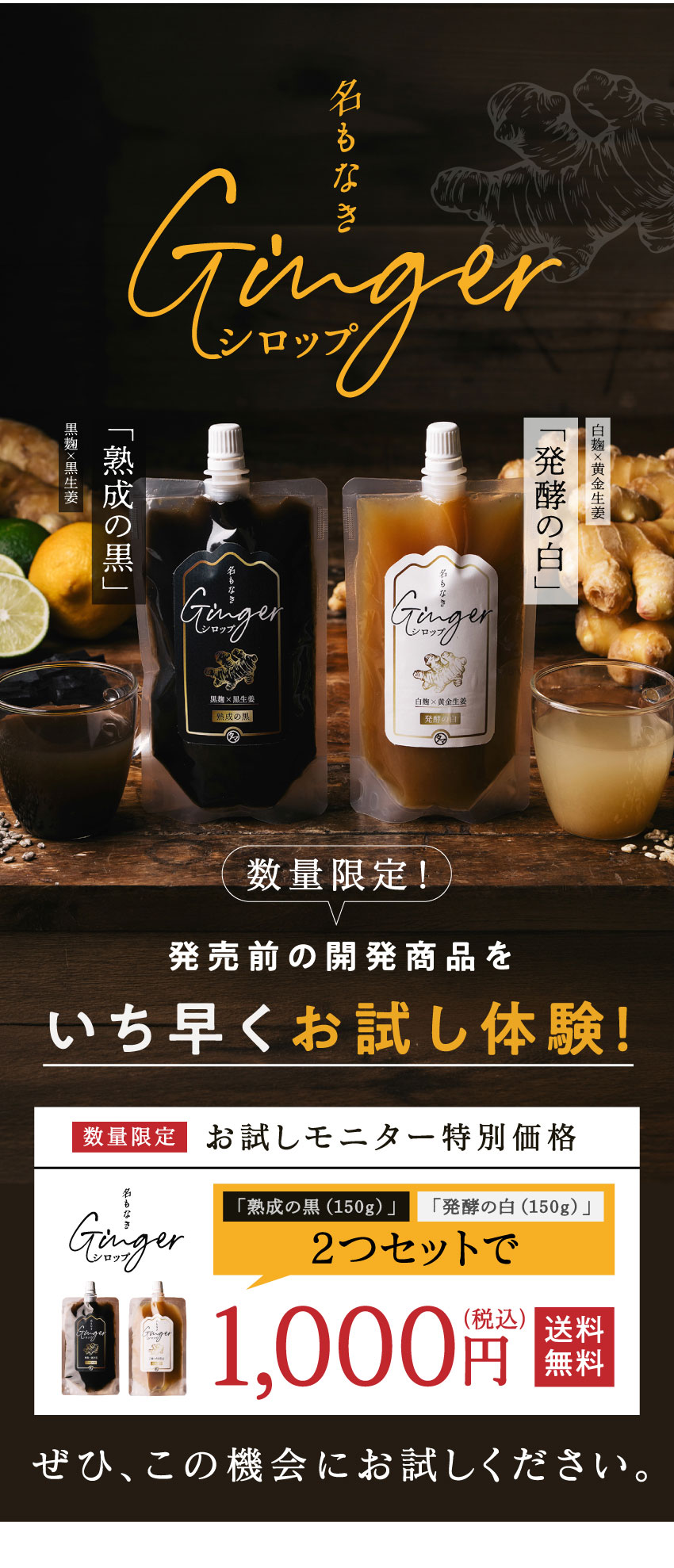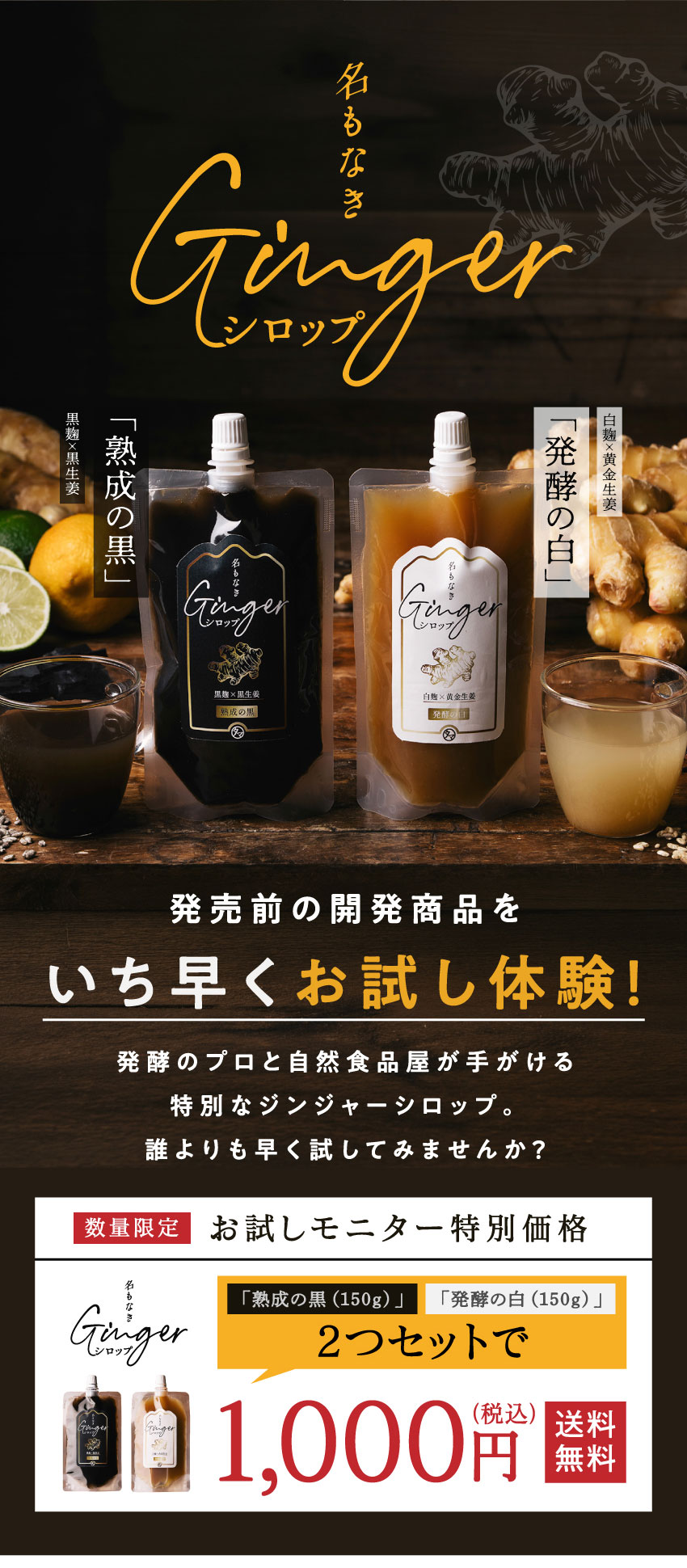 【送料無料】名もなきジンジャーシロップ 150g×2本セット 完成前の開発商品をいち早く体験 深みある熟成黒と爽やかな発酵白 シロップ 生姜 炭酸水 贈り物 ギフト 1000円【4セット迄メール便/5セット~宅配便】