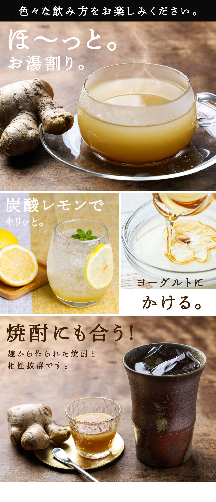 シロップ1割に対して、お湯・冷水・炭酸3割(目安)