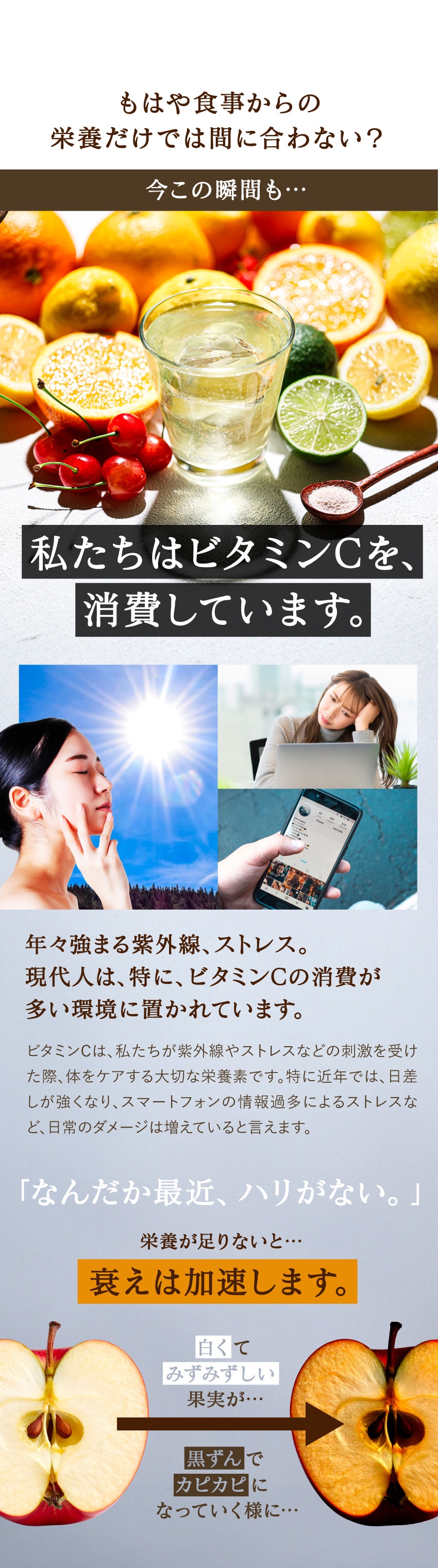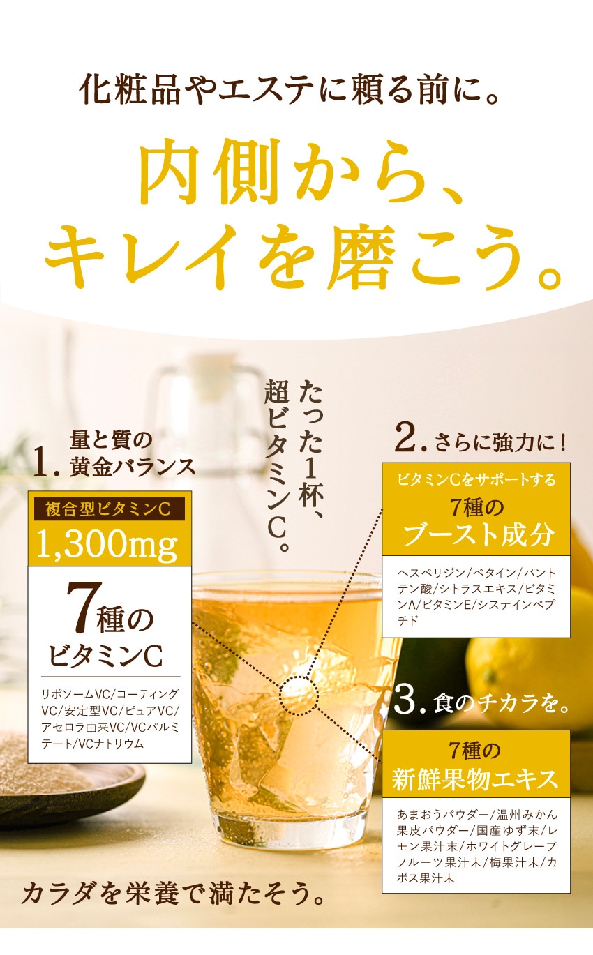 マルチトール(国内製造)、アセロラ果汁末、デキストリン、レッドビート末、植物油脂、酵母、いちご果汁末、うめ果汁末、かぼす果汁末、グレープフルーツ果汁末、シトラスアウランティウム抽出物、みかん末、ゆず末、ライチ種子抽出物、レモン果汁末、酵母抽出物、さくらんぼ果汁末/ビタミンC、クエン酸、甘味料(ステビア)、乳化剤、糊料(加工デンプン)、クエン酸カルシウム、ヘスペリジン、二酸化ケイ素、香料、パントテン酸カルシウム、ビタミンE、ビタミンA、酸化防止剤(ビタミンC)