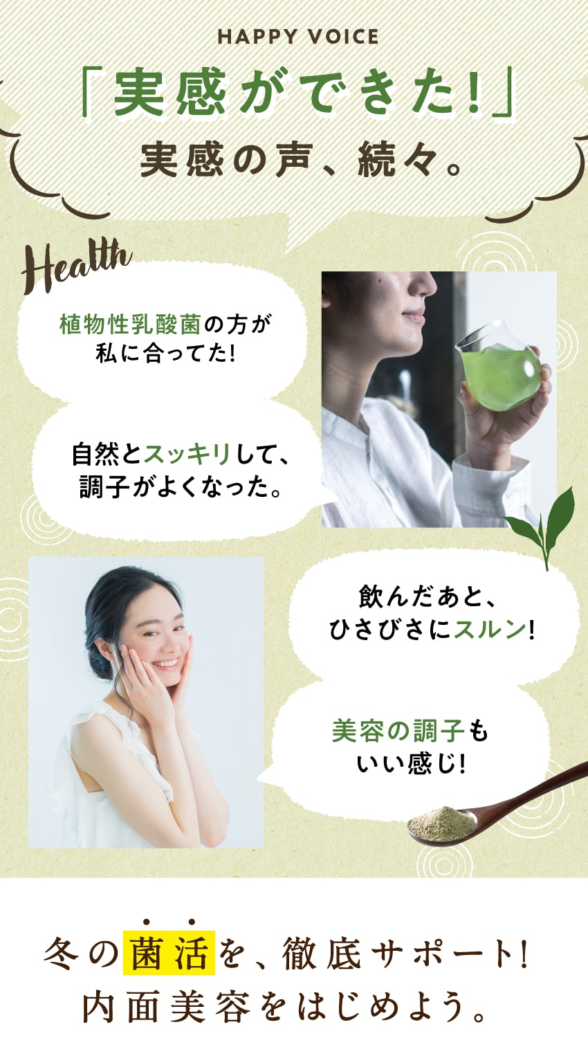 イソマルオリゴ糖(国内製造)、デキストリン、ガラクトオリゴ糖、大麦若葉末、植物発酵エキス末(大豆・キウイ・オレンジ・リンゴを含む)、スピルリナ原末、クロレラ粉末、乳酸菌(殺菌)(小麦含む)、大豆ペプチド乳酸菌発酵物、植物性乳酸菌(殺菌)、納豆菌培養エキス末、乳酸菌末(澱粉分解物、乳酸菌(殺菌))/ビタミンC、香料、ナイアシンアミド、ビタミンE、パントテン酸Ca、ビタミンB2、ビタミンB1、ビタミンB6、ビタミンA、葉酸、ビタミンD3、ビタミンB12
