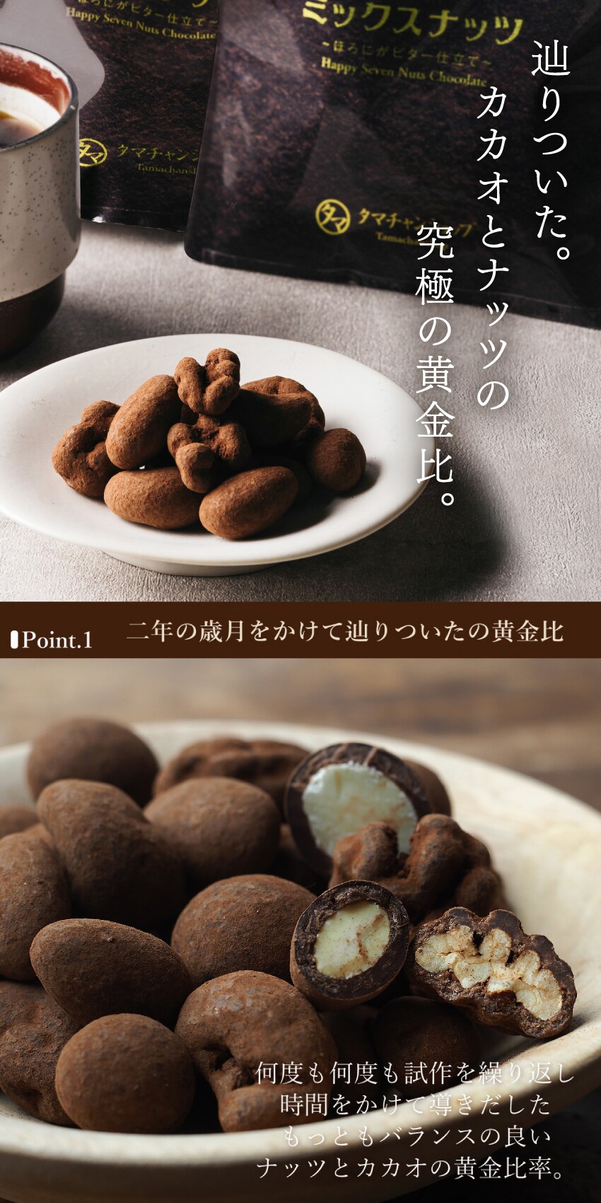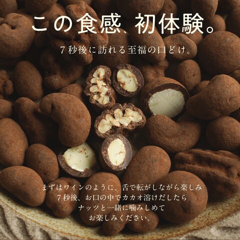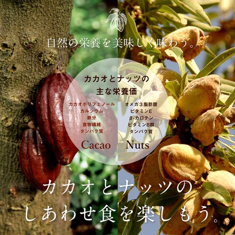 チョコレート(カカオマス、マルチトール、ココアバター、植物油脂)(国内製造)、クルミ、カシューナッツ、アーモンド、ピーカンナッツ、マカ デミアナッツ、ヘーゼルナッツ、ピスタチオ/乳化剤(大豆由来)、香料、甘味料(ラカンカ抽出物)、(一部に乳成分・アーモンド・カシューナッ ツ・くるみ・大豆を含む)