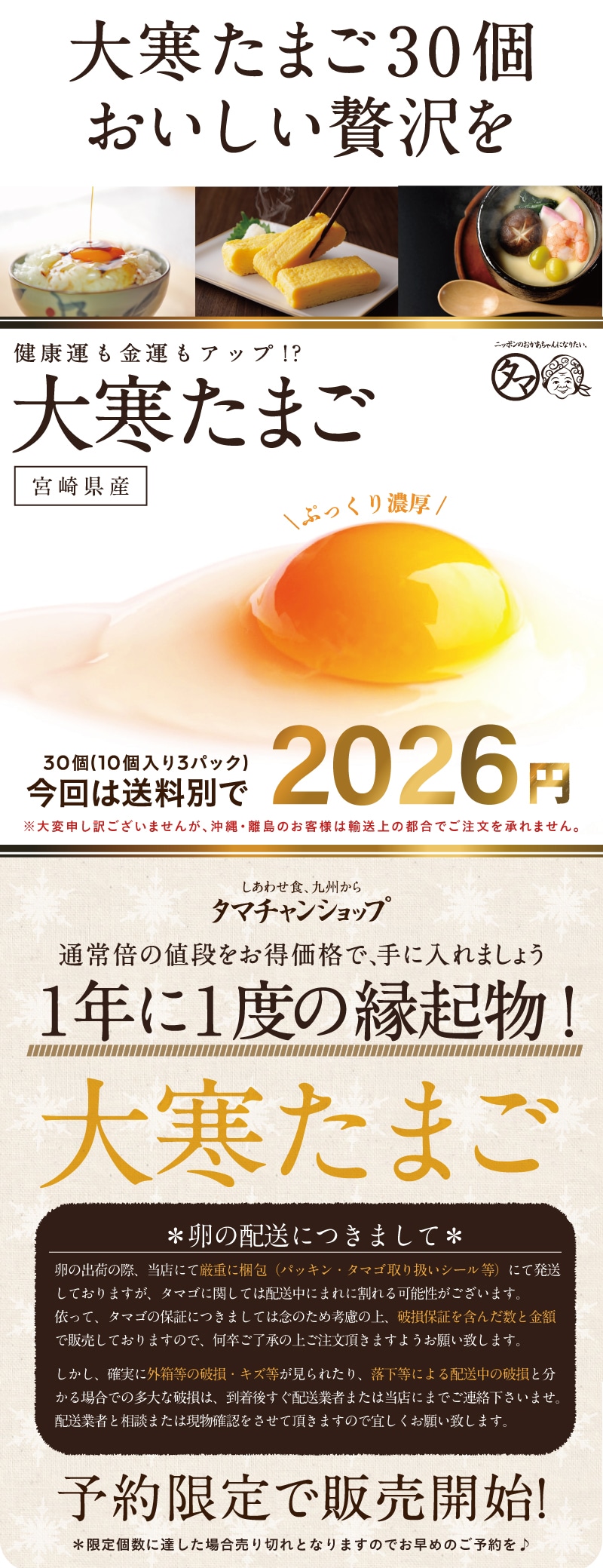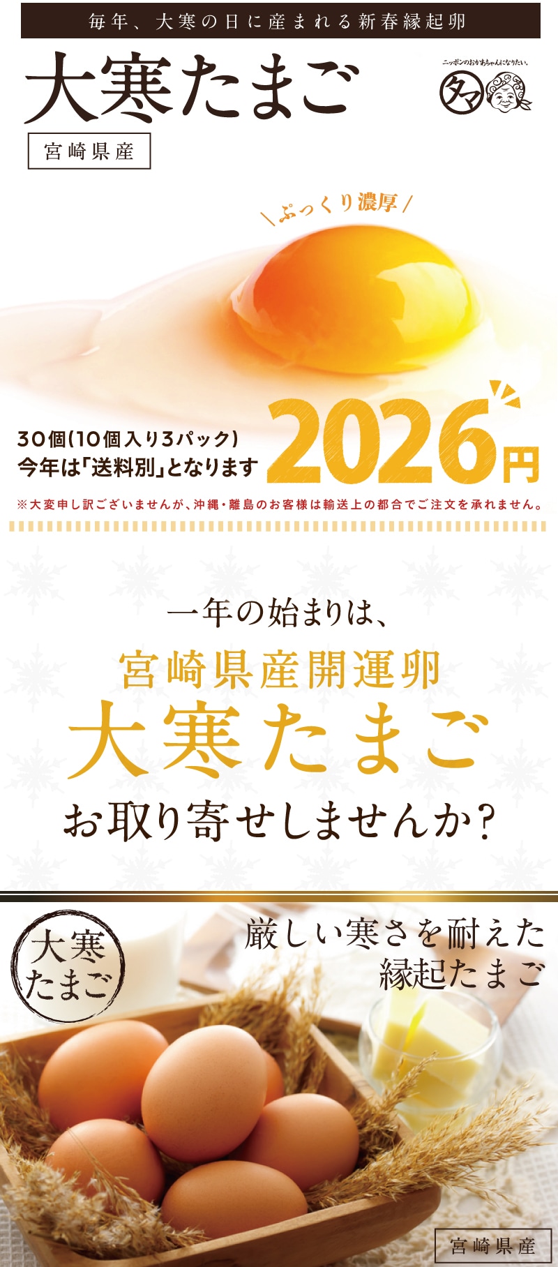 【ご予約】大寒たまご30個 縁起卵 南九州産2026年 大寒の日前後に生まれる(2026年1月20日頃)滋養に富んだ、縁起物のタマゴを数量限定販売!品質・衛星すべて管理された安心・安全たまご【沖縄・離島は輸送の都合上ご注文承れません】送料別 ※2026年1月20日より順次発送 ※お一人様1セット迄