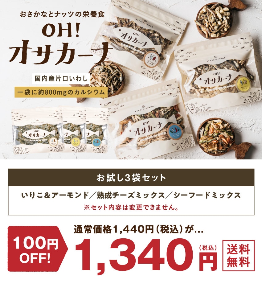 定番の3種を試してみたい方におススメのオサカーナ3袋セット!子供から大人まで、美味しくヘルシーに、いつでもどこでも新時代のおやつ革命。