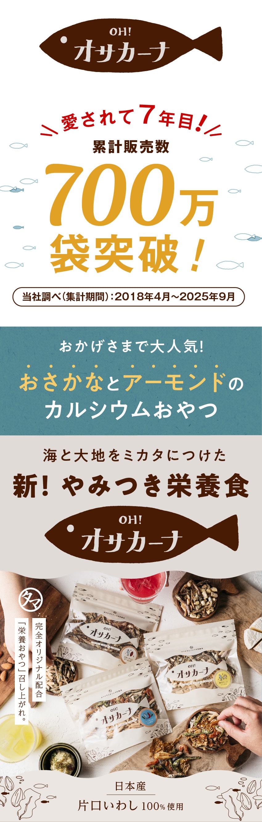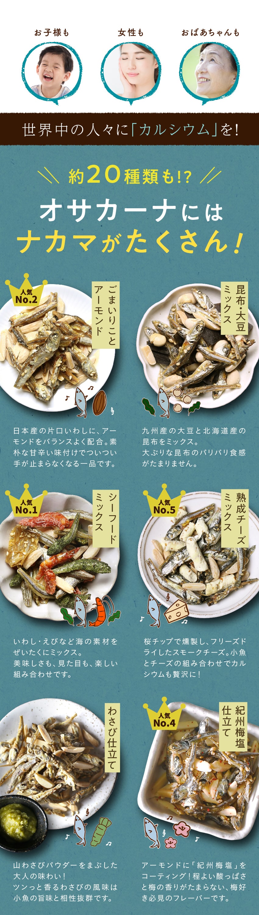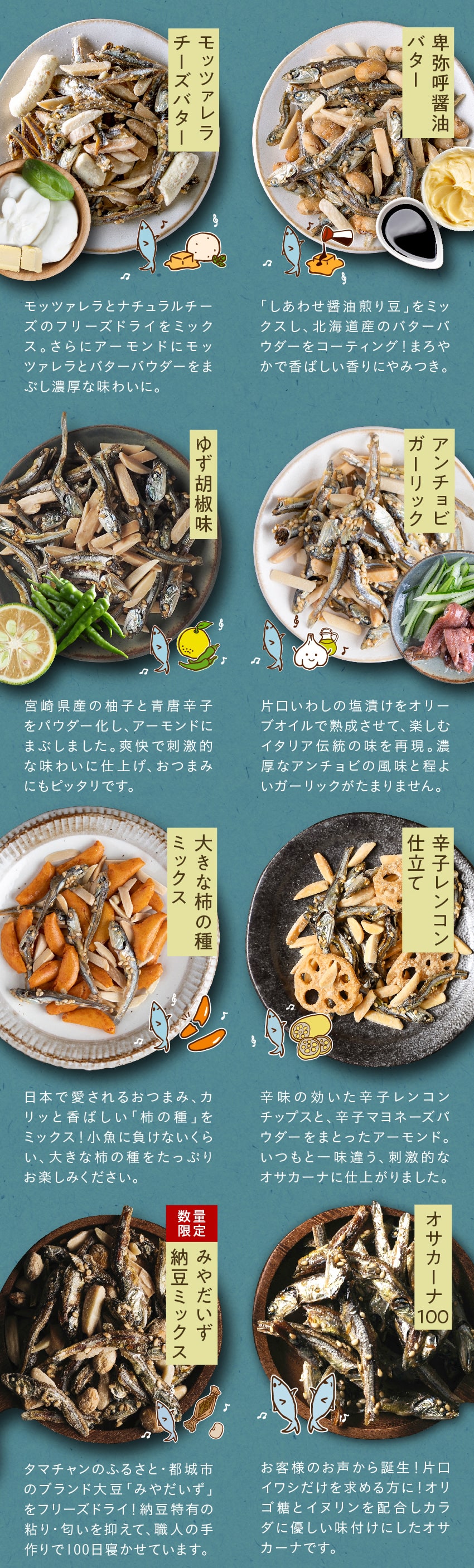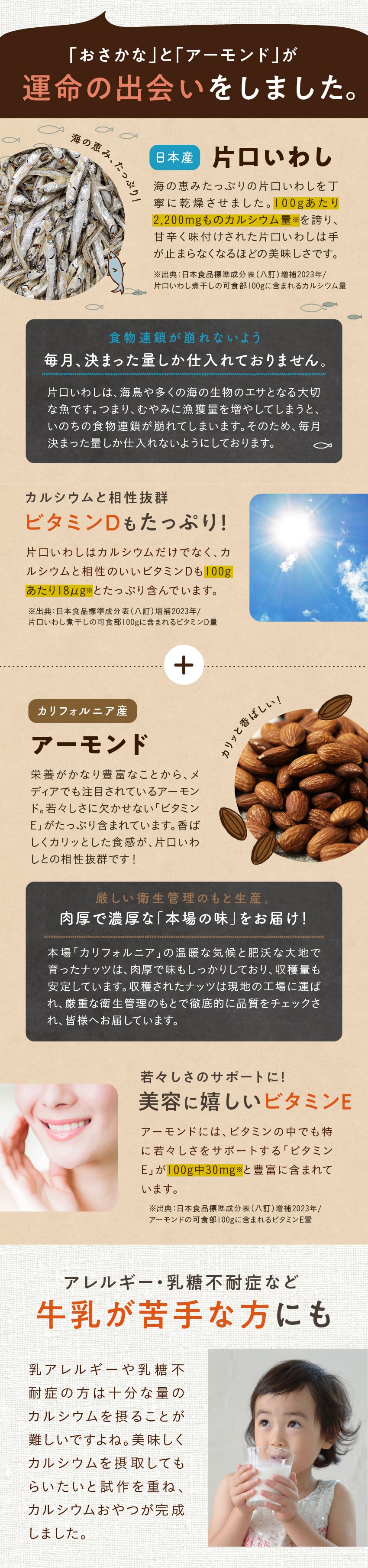 いわし煮干し(国内製造)、アーモンド(アメリカ産)、砂糖、白ごま、醤油、水飴、澱粉分解物、食塩、マロン粉末、植物油脂/調味料(アミノ酸等)、レシチン(大豆由来)、香料、(一部に小麦・大豆・ごま・アーモンドを含む)