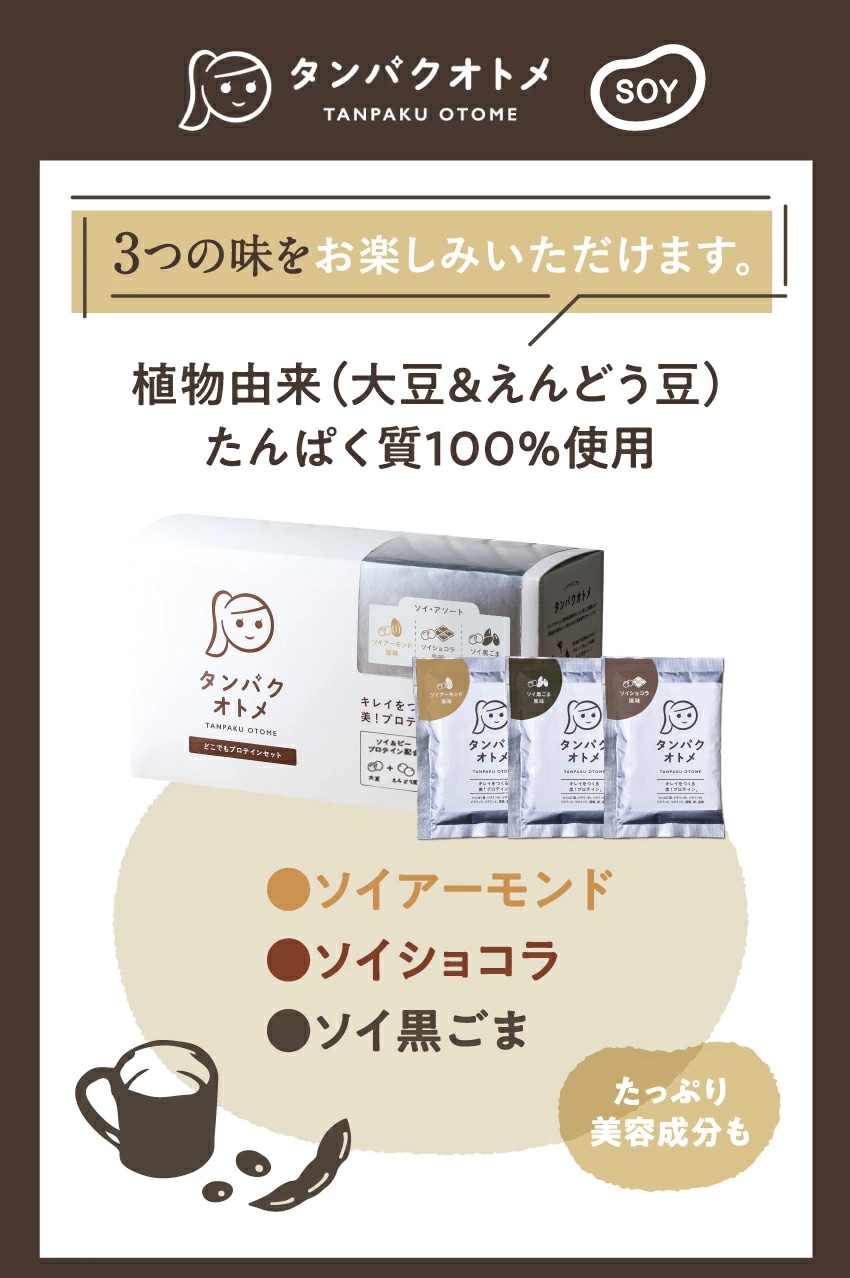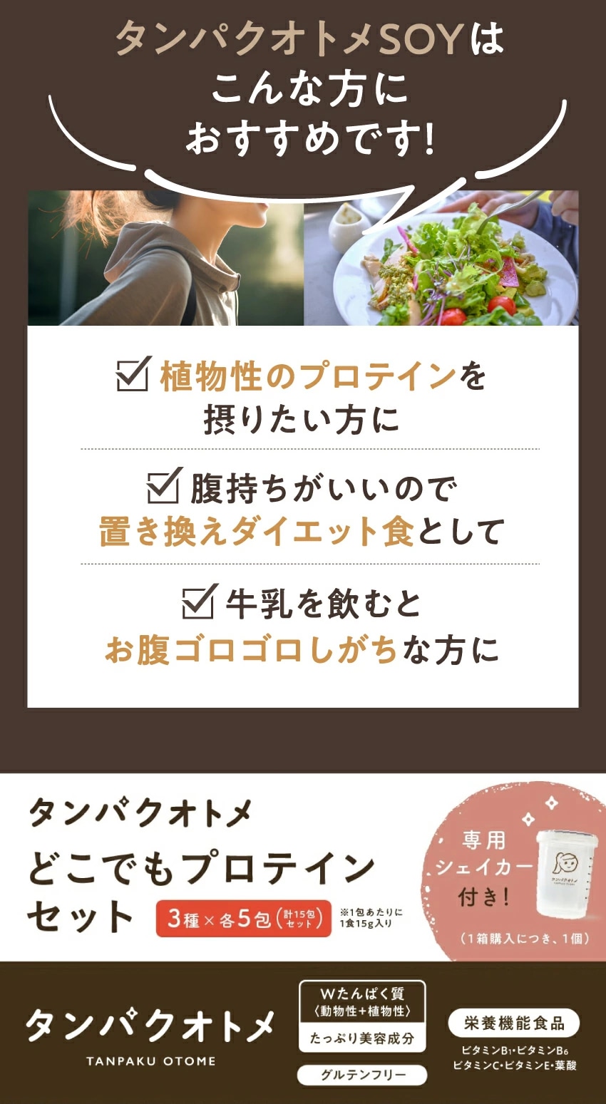 タンパクオトメ 分包タイプ 15食セット(3種×5包) 【カフェアソート】おでかけ用・持ち運びに便利な女性のための分包タイプ 不足しがちなタンパク質と美容成分を配合 ホエイ&大豆ソイプロテイン 砂糖不使用 ダイエット プロテイン シェイカー1個プレゼント付【送料無料】