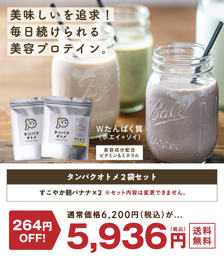 タンパクオトメ2袋セット【すこやか朝バナナ×すこやか朝バナナ】 女性専用プロテイン ホエイプロテインと大豆ソイをW配合。タンパク質と美容成分たっぷり、おきかえダイエットにもおすすめの低糖質プロテイン。【送料無料】【1セット迄メール便/2セット~宅配便】