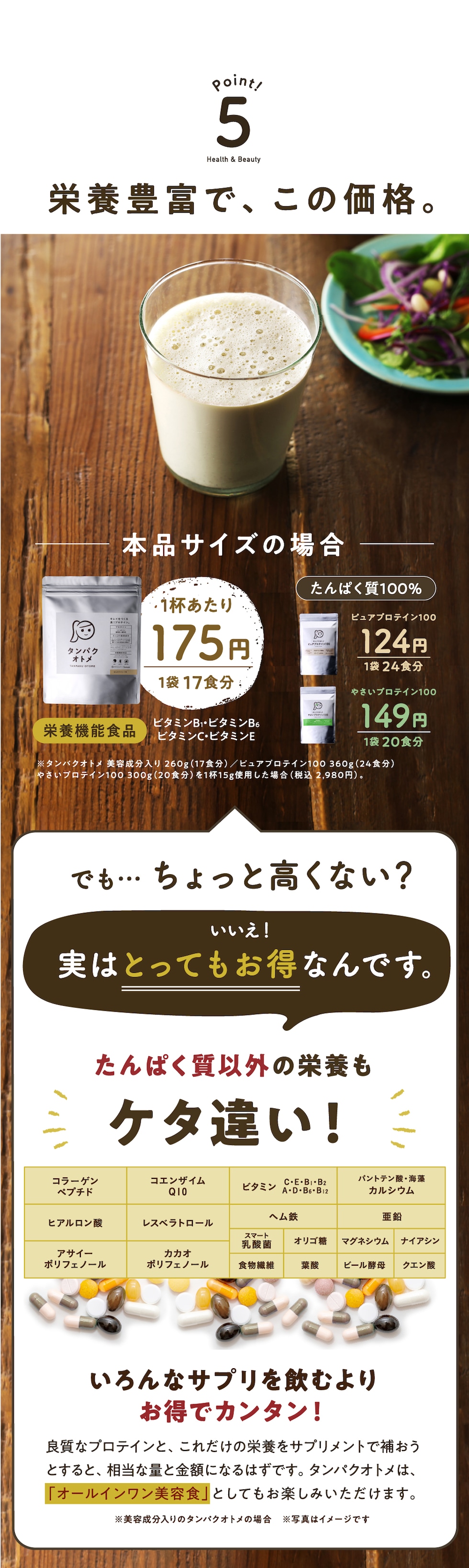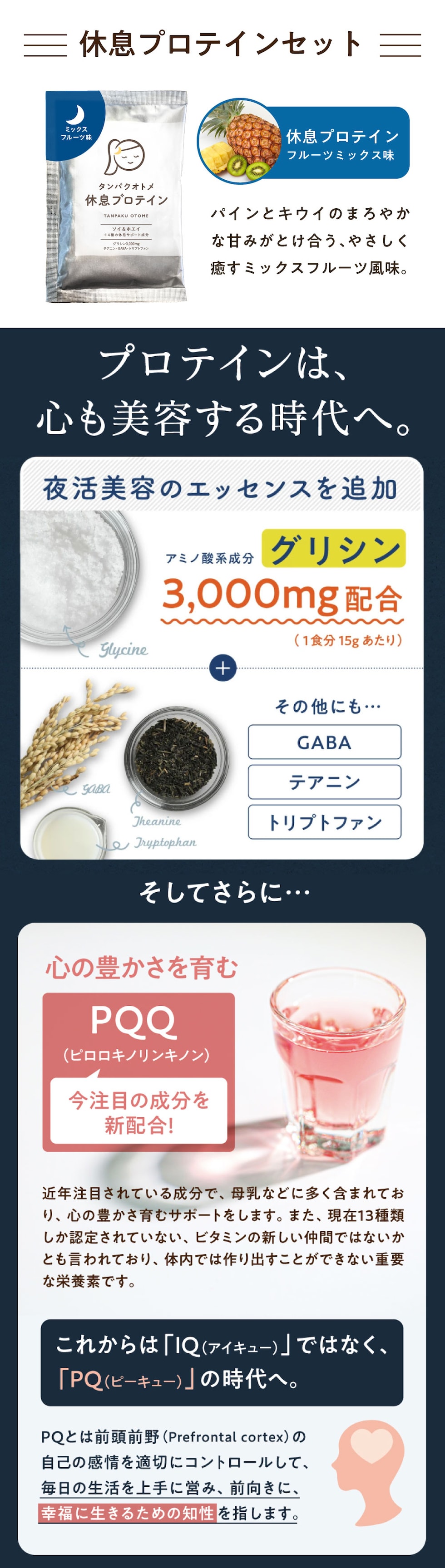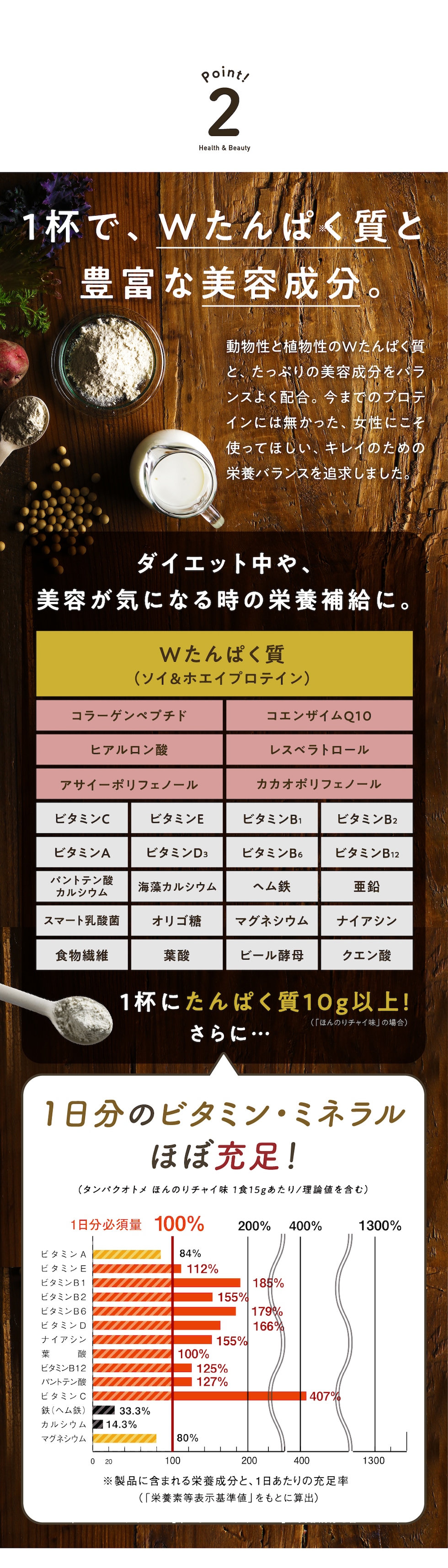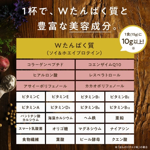大豆たんぱく(大豆を含む)(国内製造)(分別生産流通管理済み)、乳清たんぱく(乳成分を含む)、パイナップル果汁末、デキストリン、海藻カルシウム、オリゴ糖、ビール酵母、りんごファイバー(リンゴを含む)、グルコマンナン、コラーゲンペプチド(鮭由来ゼラチン)、赤ワインエキス末、GABA、アサイー末、カカオエキス末、乳酸菌(還元澱粉糖化物、乳酸菌)、コエンザイムQ10/グリシン、ビタミンC、クエン酸、酸化マグネシウム、甘味料(羅漢果抽出物)、ヘム鉄、香料、ナイアシン、トリプトファン、テアニン、ヒアルロン酸、グルコン酸亜鉛、ビタミンE、パントテン酸カルシウム、ビタミンB1、ビタミンB6、ビタミンB2、ビタミンA、葉酸、ビタミンD3、ビタミンB12 アレルギー表示:大豆・乳・さけ・りんご