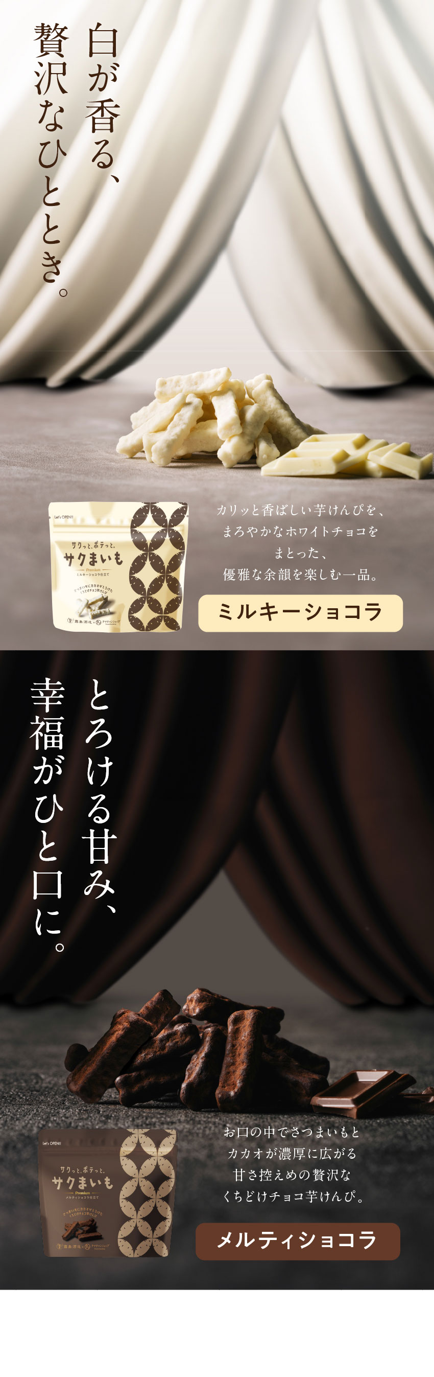 ミルキーショコラ:さつまいも(国産)、植物油脂(パーム油)(国内製)、チョコレート(植物油脂、イヌリン、乳タンパク、全粒乳、砂糖、ココアパウダー)/乳化剤、香料、甘味料(ラカンカ抽出物)、酸化防止剤(ビタミンC)、(一部に乳成分・大豆を含む)