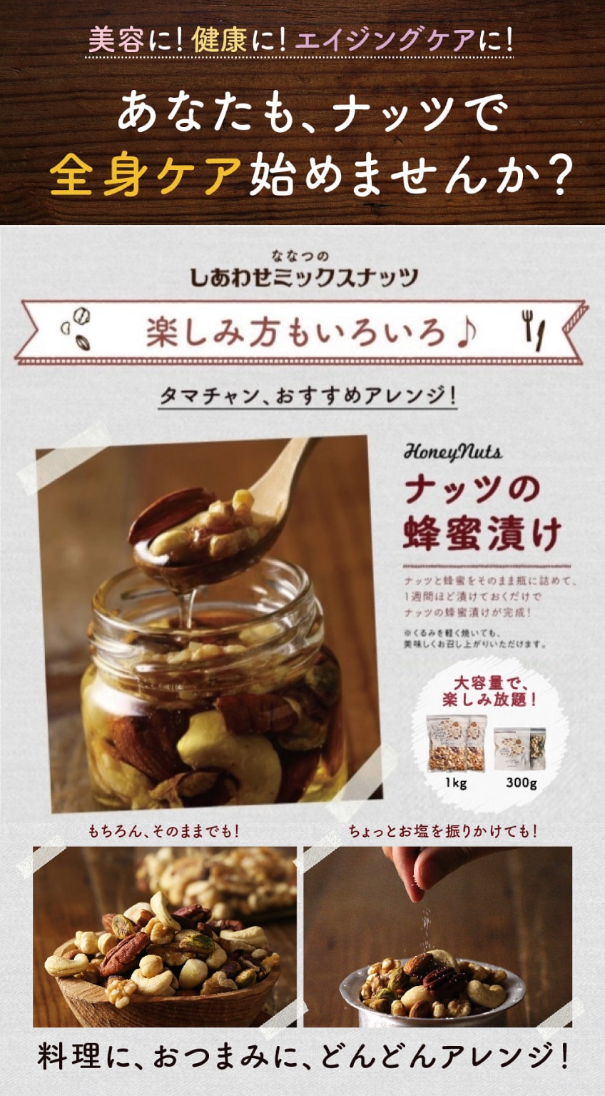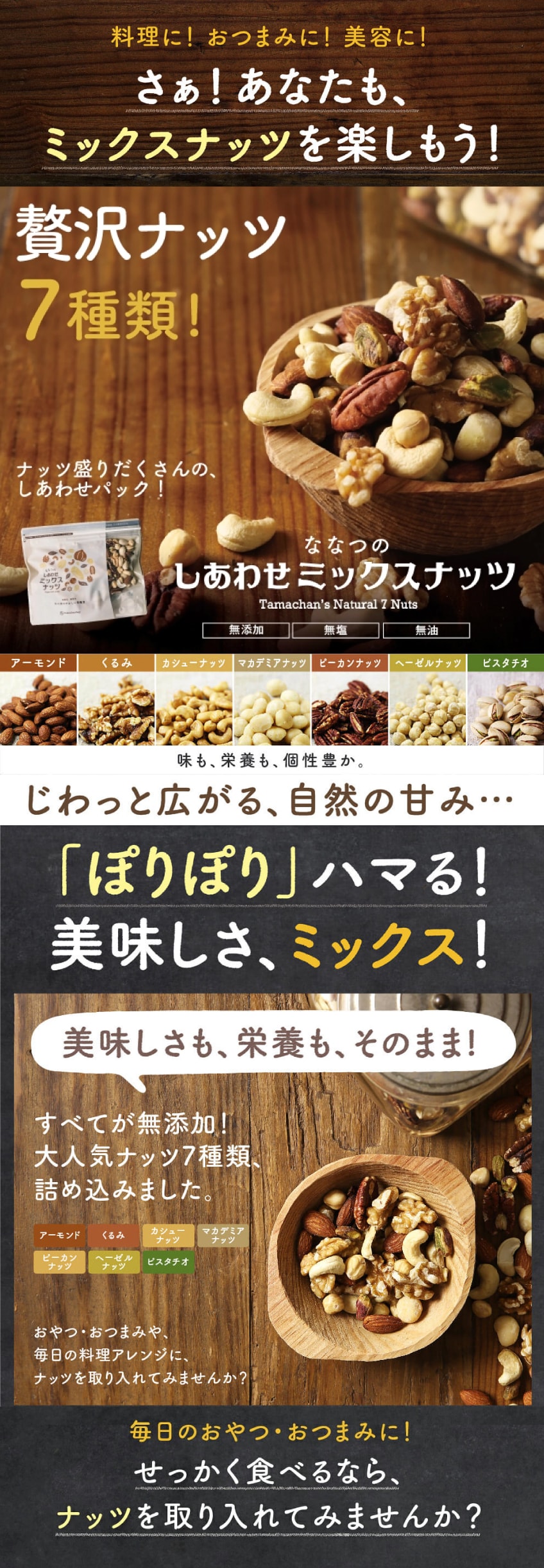 クルミ(アメリカ産)・アーモンド(アメリカ産)・カシューナッツ(インド産)・ピーカンナッツ(アメリカ産)・マカデミアナッツ(ケニア・マラウイ産)・ヘーゼルナッツ(トルコ産)・ピスタチオ(アメリカ産)